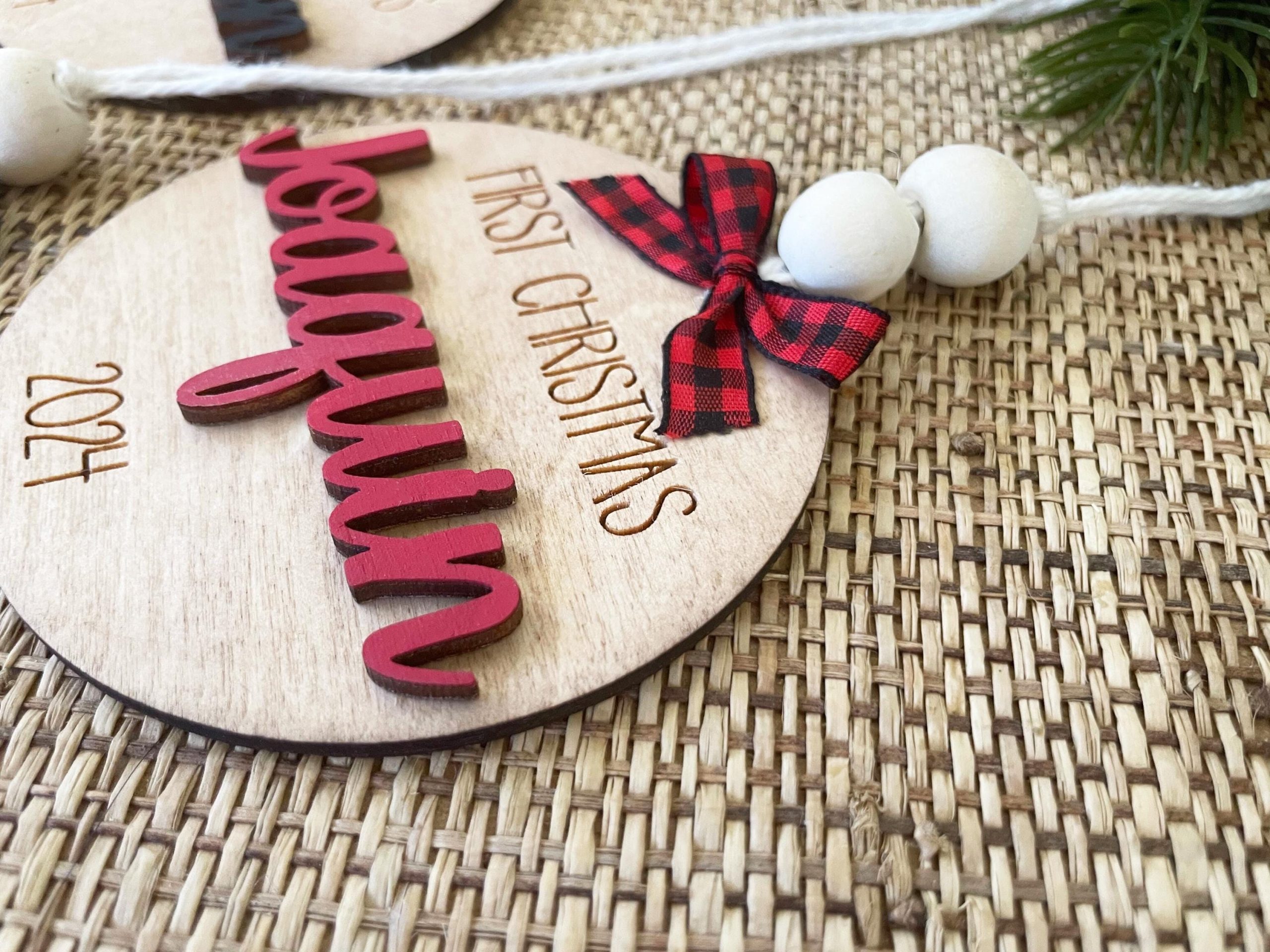 Celebrate baby’s first Christmas with a cute personalized wood ornament! These are 3 & 1/2″ wide and baby’s name is a 2nd layer of wood. There are two wooden beads at the top, in addition to a sweet little bow if you choose. You can customize by choosing your own paint color for the name! They’re made from 2 layers of baltic birch, with string attached for hanging.