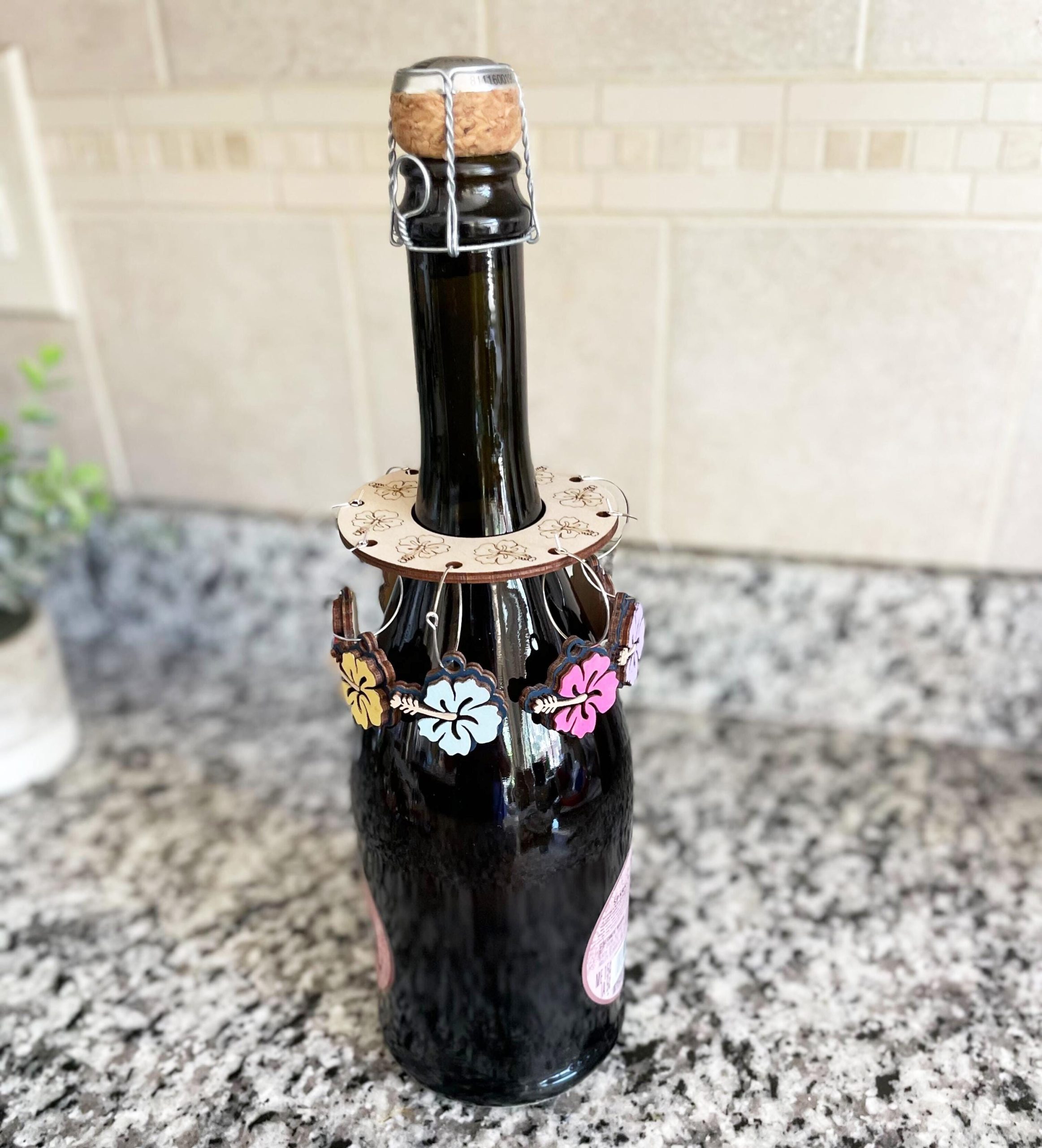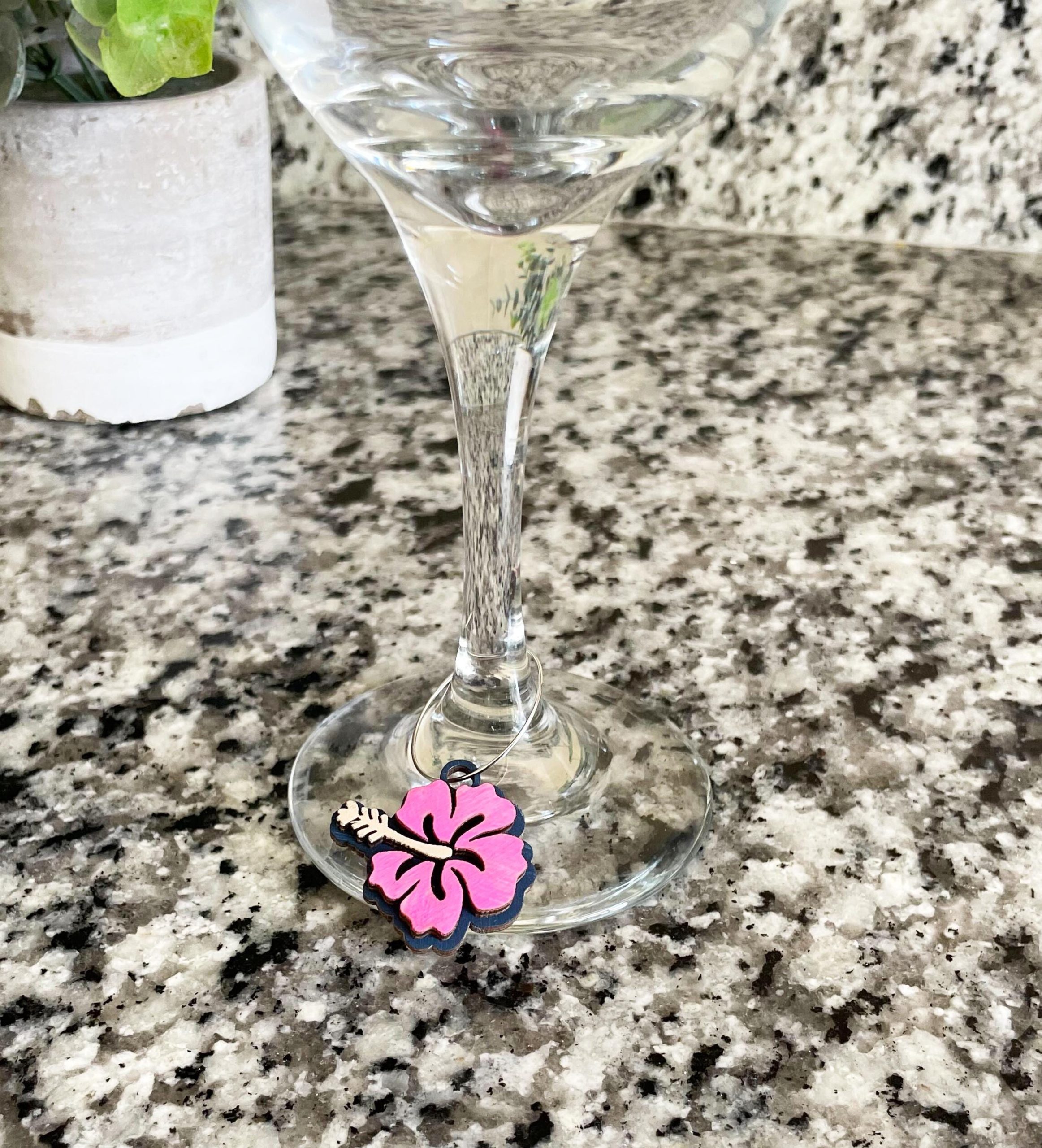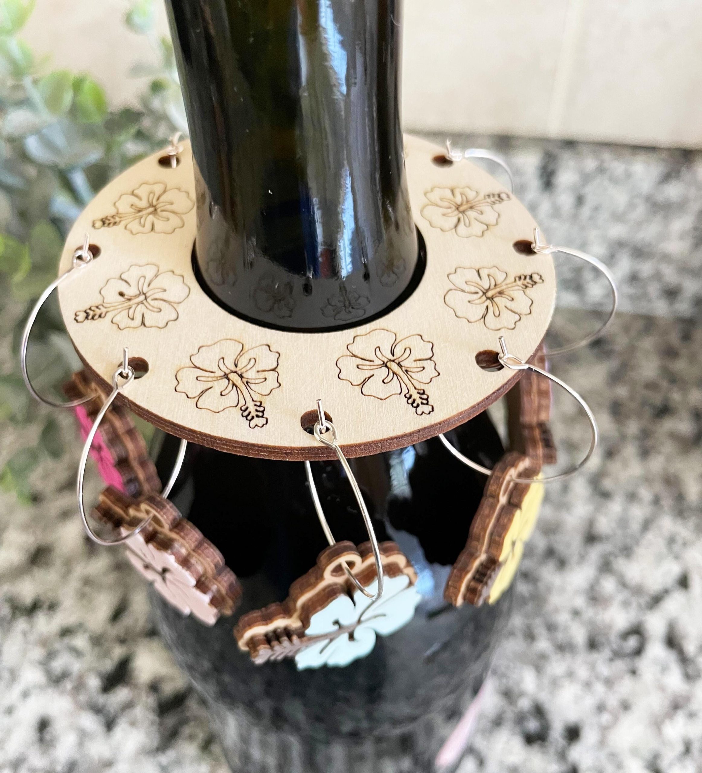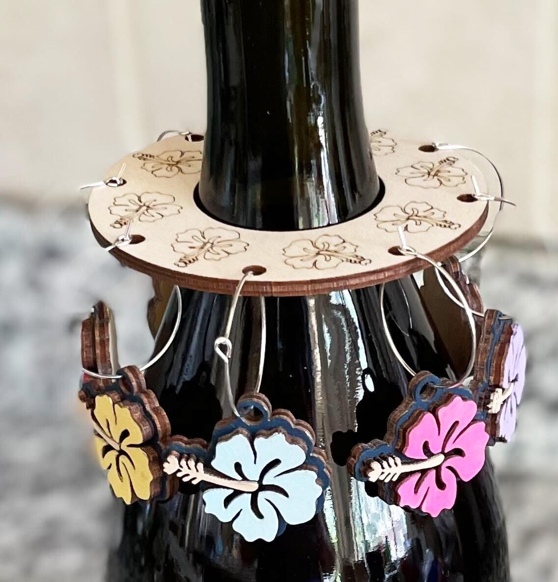 Add some tropical hawaiian vibes to your next dinner or cocktail party! This set of 8 hibiscus flower wine charms can be customized with your color choices. Each charm is made of 2 layers of wood and the set comes with a hanger that not only holds all of the charms, but rests on the wine bottle for easy access for your guests!
