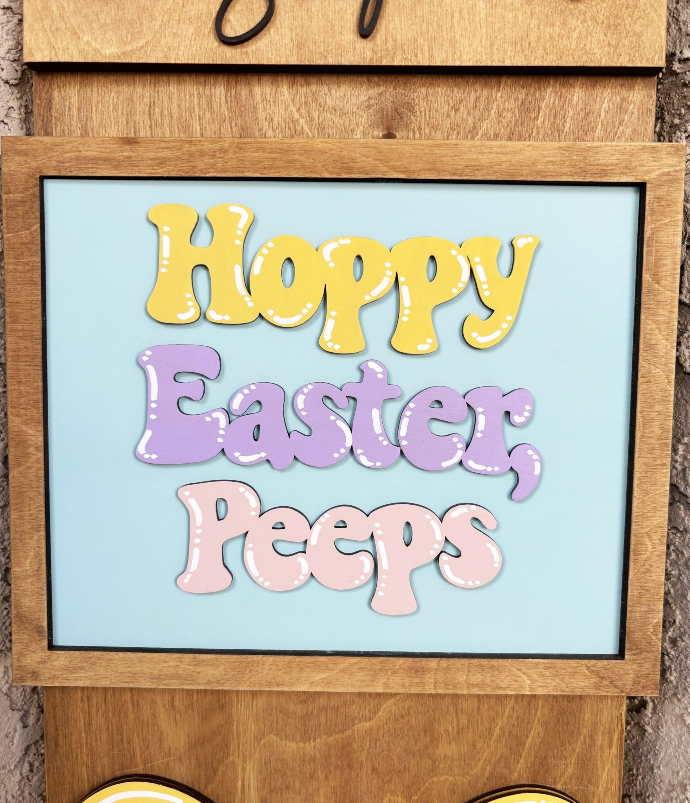 Decorate your front porch for spring with this adorable set that goes in our interchangeable porch leaner base! This set features cute Peeps style bunnies and the center insert says “Hoppy Easter, Peeps”. If you like doing crafts, you can get this unpainted and decorate it yourself! Once you have the Back Board with the Base Kit, you change the theme out easily with any of our other kits!
