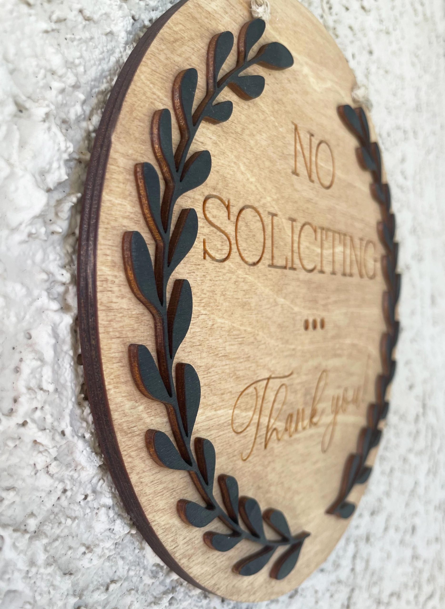 Keep away those solicitors in a nice, polite way! This pretty wood signs says it all – “No Soliciting – Thank you!”. Made from 2 layers of baltic birch plywood. This would make a great new apartment or housewarming gift!