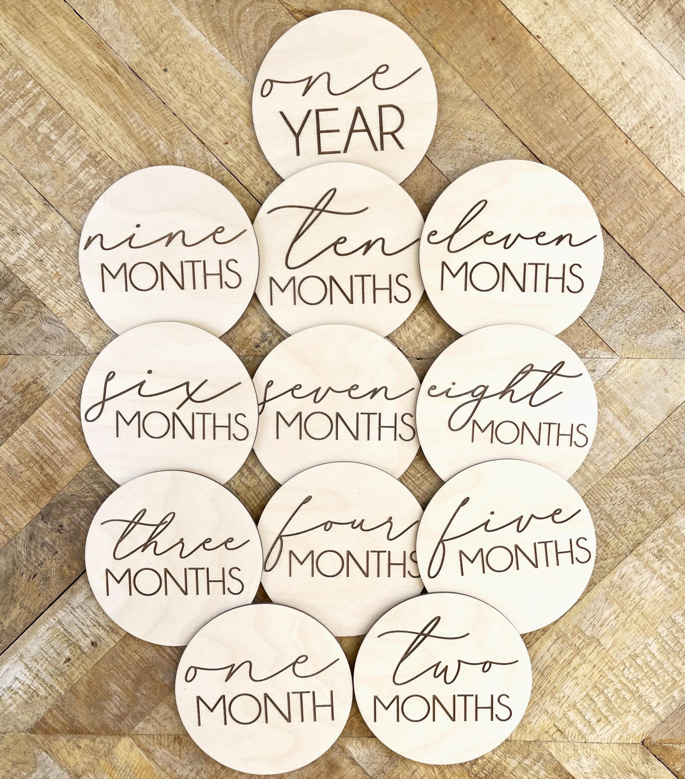 • Set of 12 discs includes: “one” thru “eleven” months and “one year”