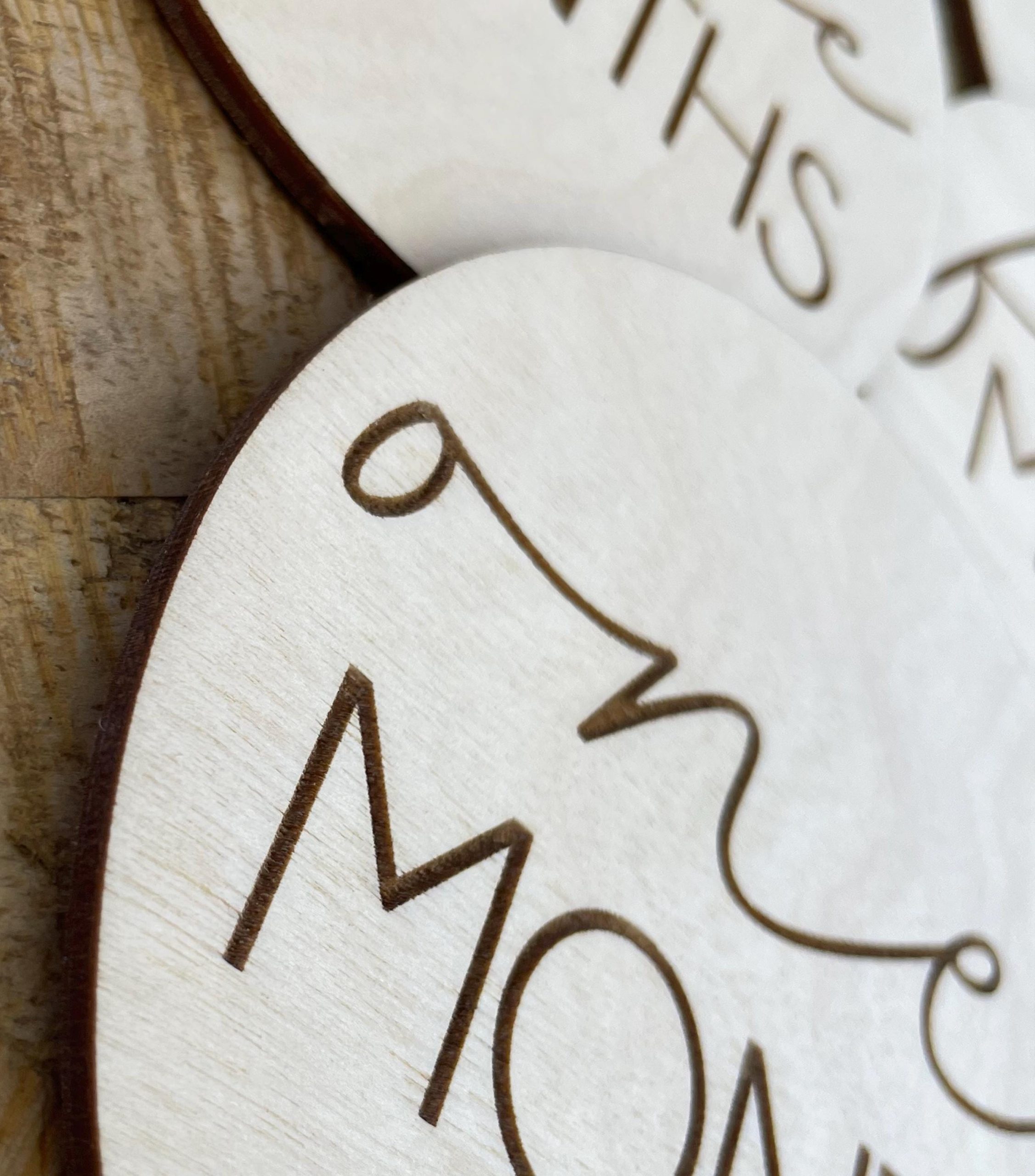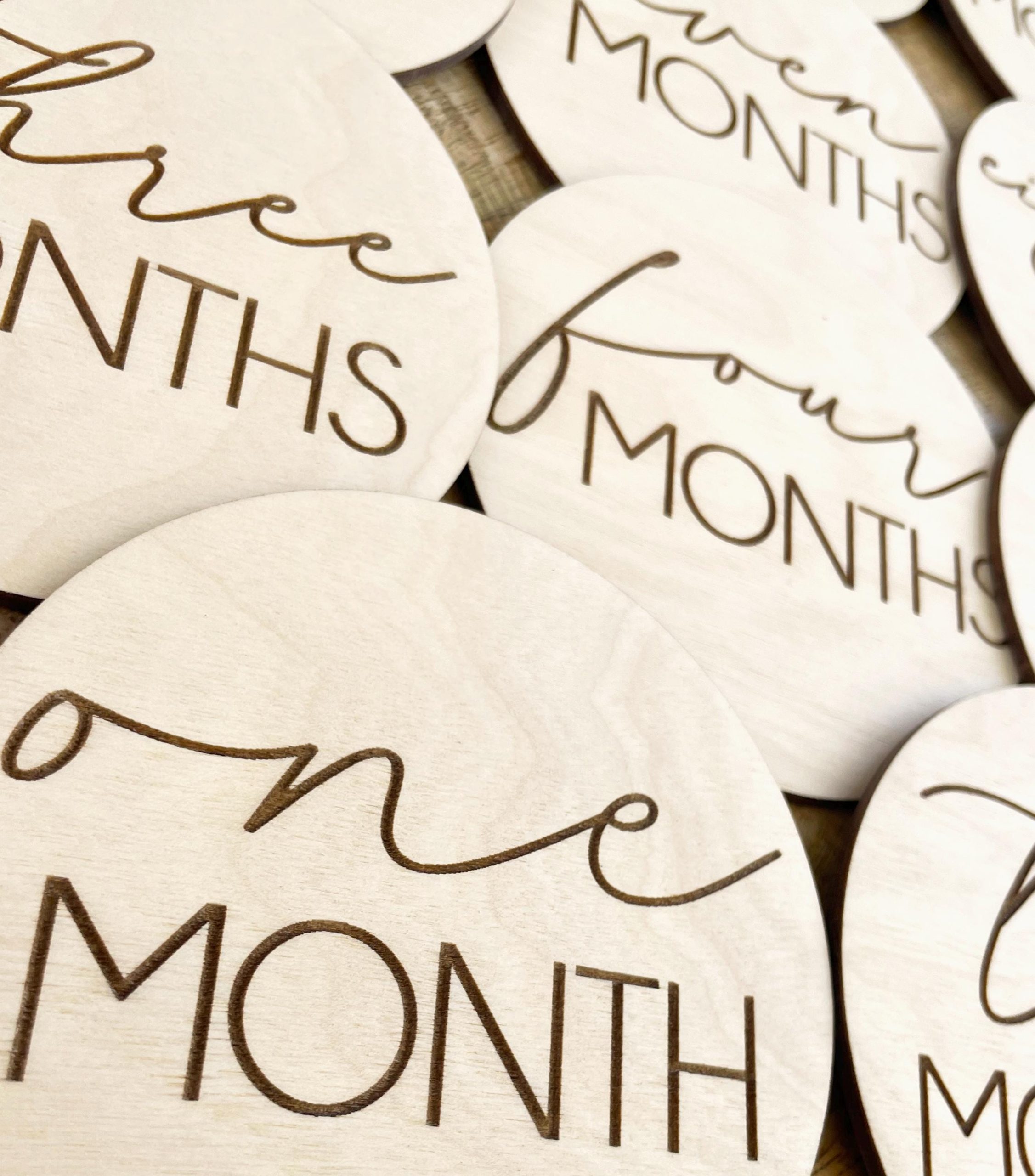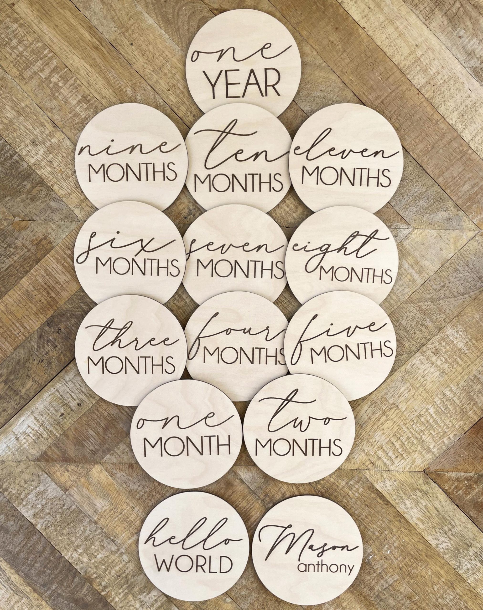 Documents your baby’s growth for the first year through photos using our wooden monthly markers! The month is engraved in a flowy, cursive font. You can order a 12 piece set for just each month, or a 14 piece set which also includes “hello world” and baby’s name. These will help you create a treasured collection of photos showing the progression of your baby’s first year.