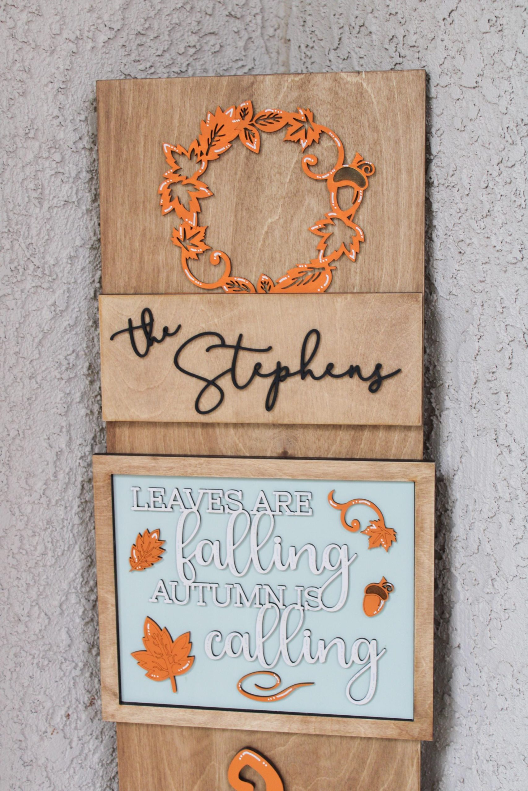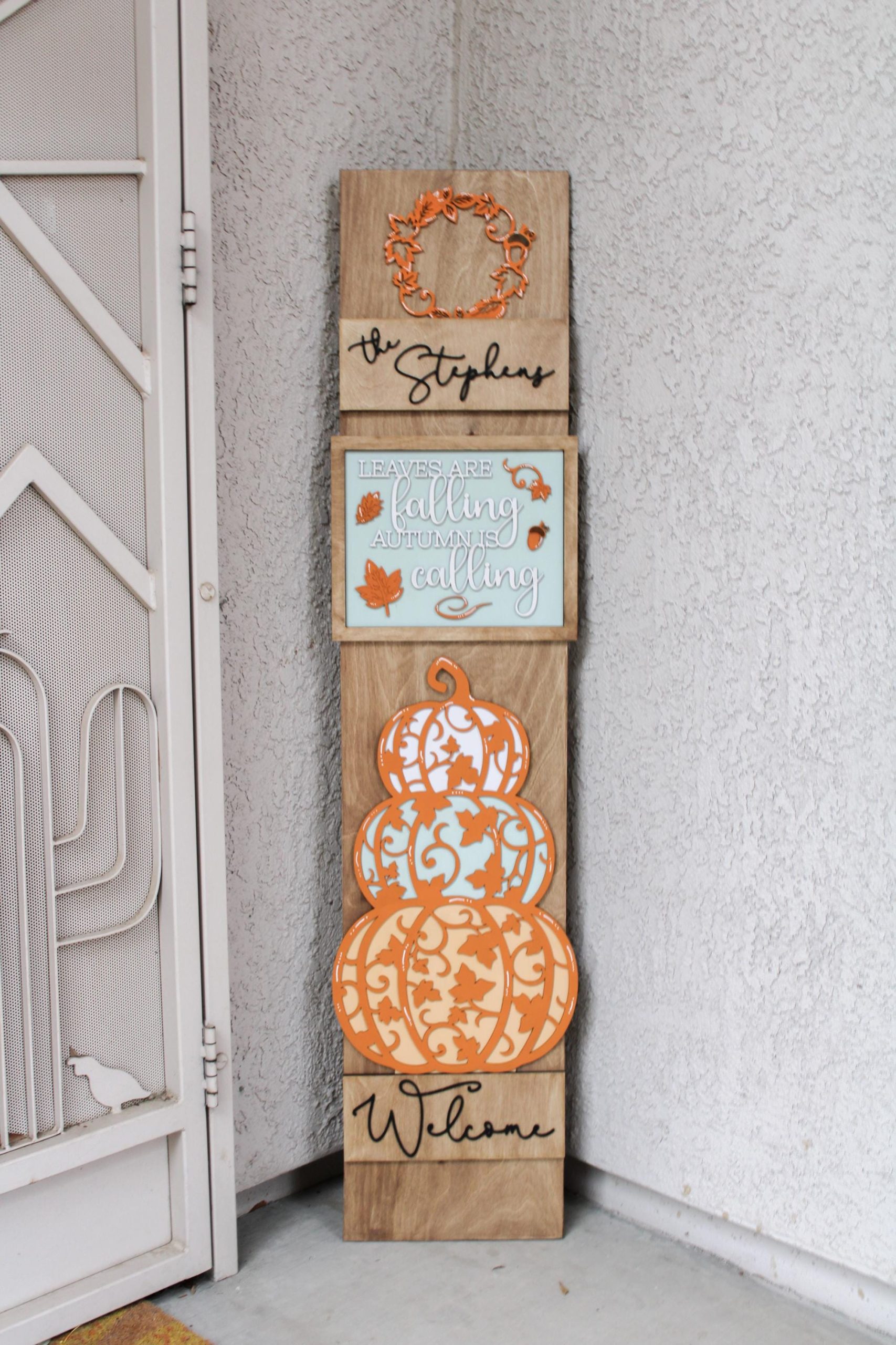 Decorate your front porch for fall with our stacked pumpkin set that goes in our interchangeable porch leaner base! This set features a fall leaf wreath on top, a sign in the middle that says “Leaves are falling, autumn is calling” and three stacked pumpkins with overlaying vines at the bottom. If you like doing crafts, you can get this unpainted and decorate it yourself! Once you have the Back Board with the Base Kit, you change the theme out easily with any of our other kits!