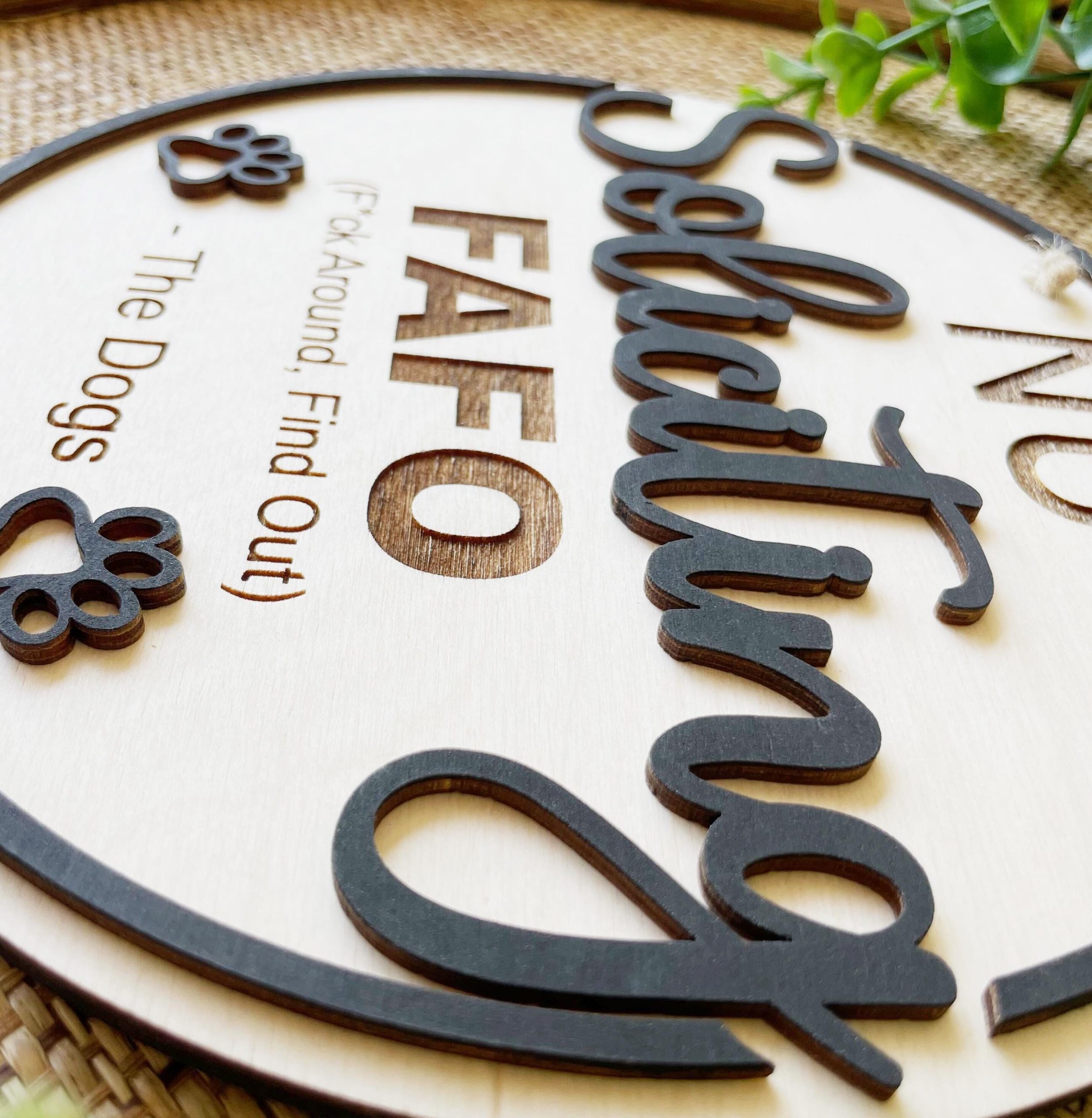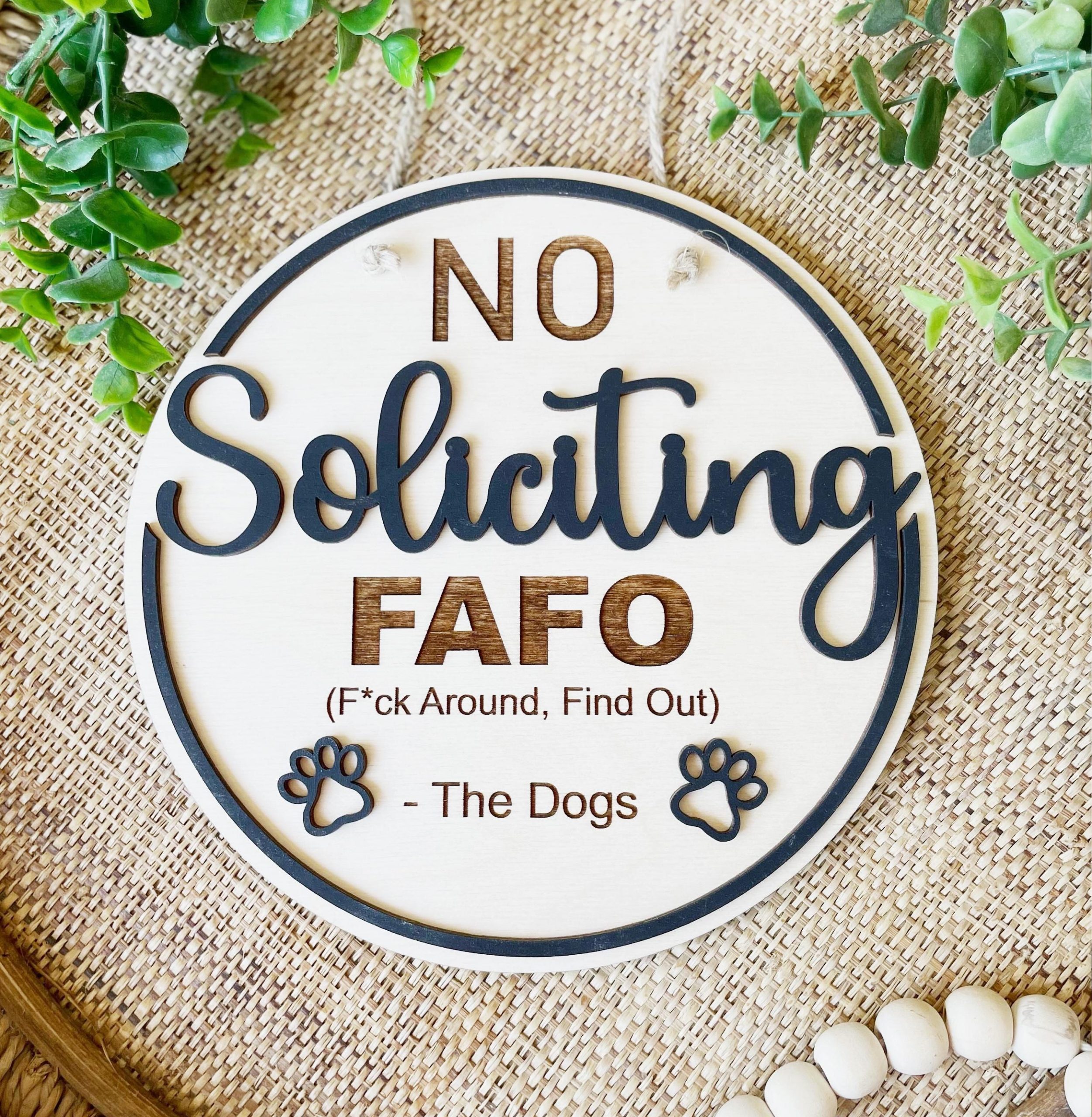 For solicitors who want to find out, the dogs aren’t F*cking around! This funny no soliciting sign says “No Soliciting – FAFO (F*ck Around Find Out) – The Dogs”. Made of 2 layers of baltic birch plywood. All words are engraved except “Soliciting”, which is a 2nd layer of wood, as well as the paw prints and outline. This makes a great gift for the dog lover in your life!