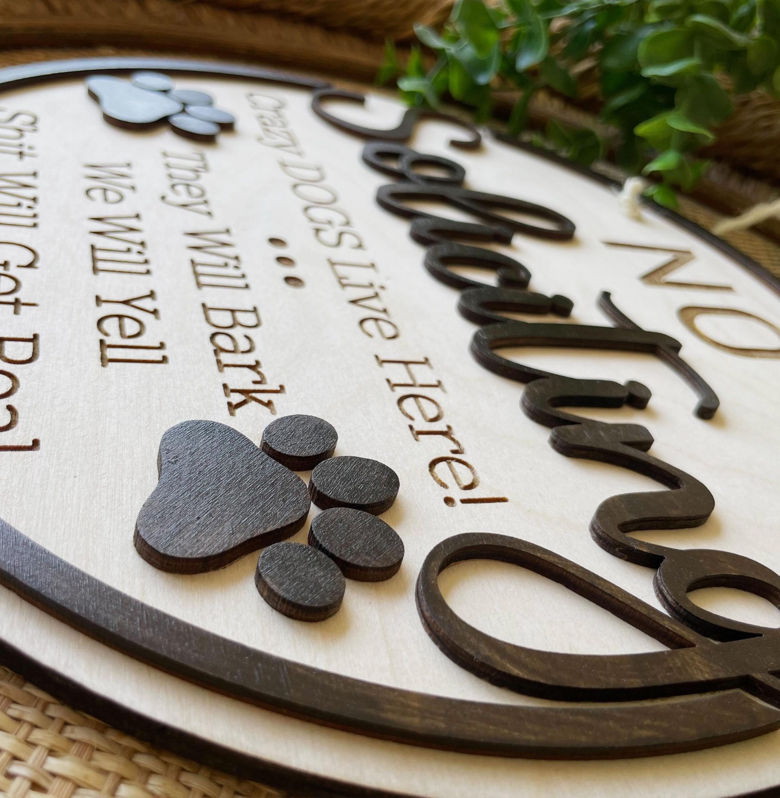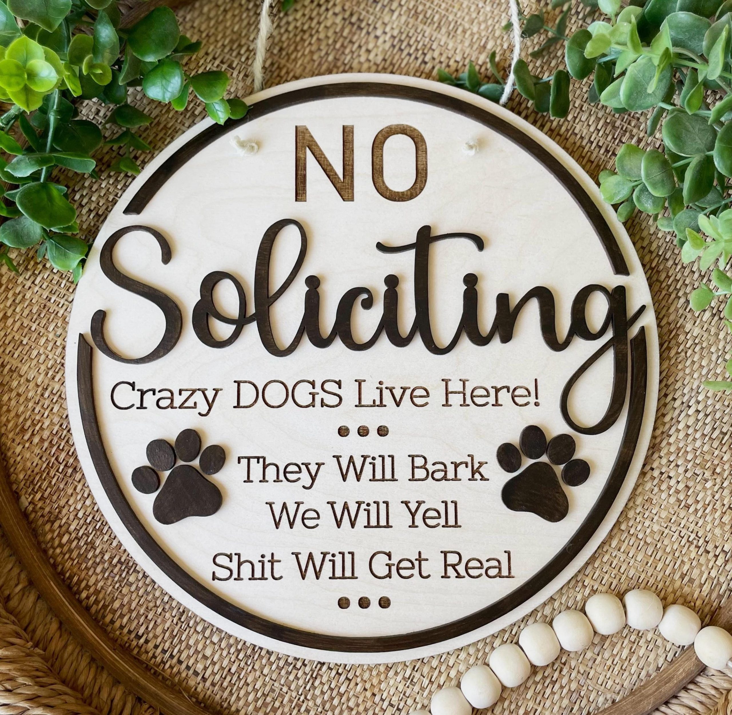 If you have barking dogs, you can keep those solicitors away with this humorous sign! Made of 2 layers of baltic birch plywood, the sign says “No Soliciting – crazy dogs live here. They will bark. We will yell. Shit will get real”. All words are engraved except “Soliciting” is a 2nd layer of wood, as well as the circle around the words. This makes a great gift for that dog lover who has a good sense of humor and doesn’t mind a bad word! 🙂