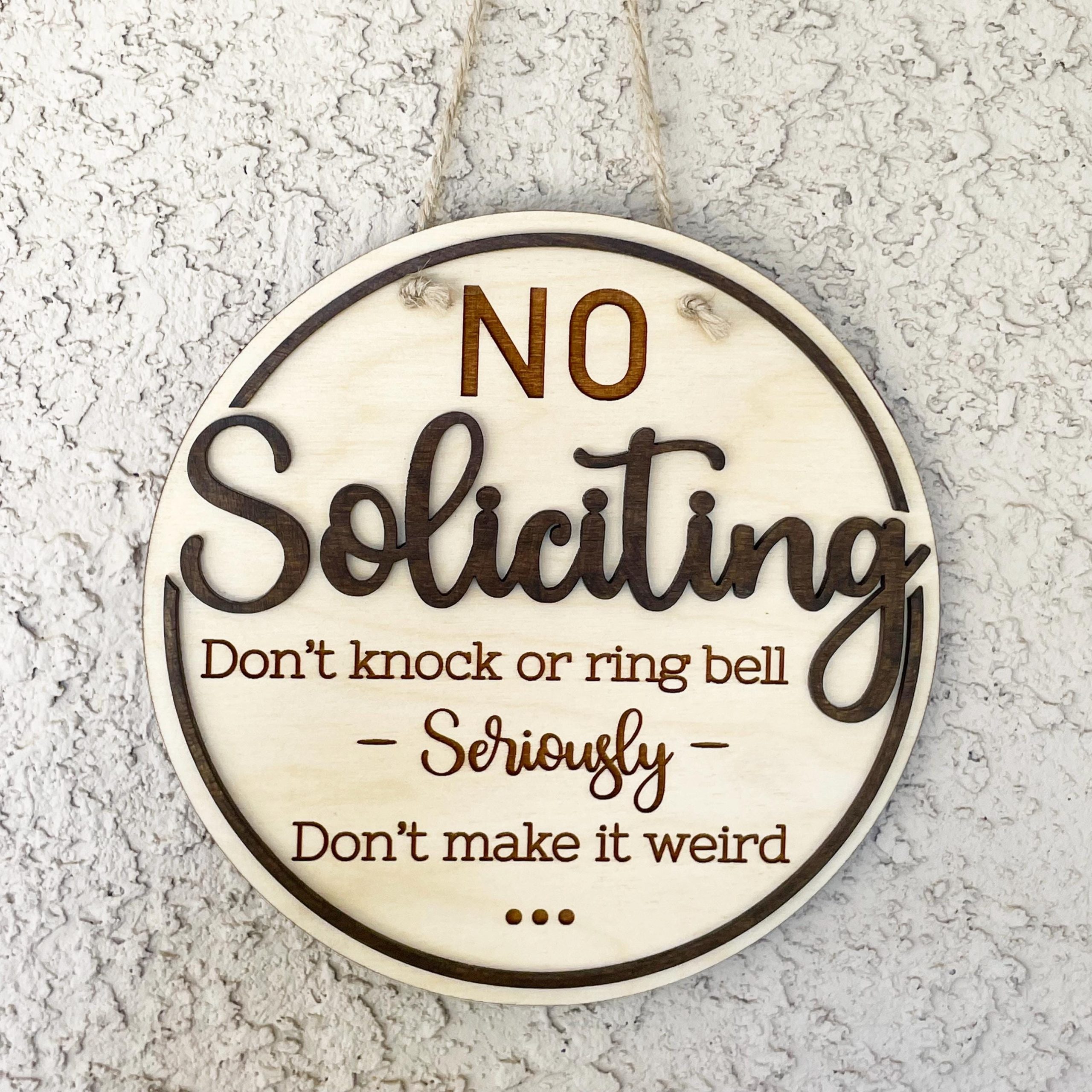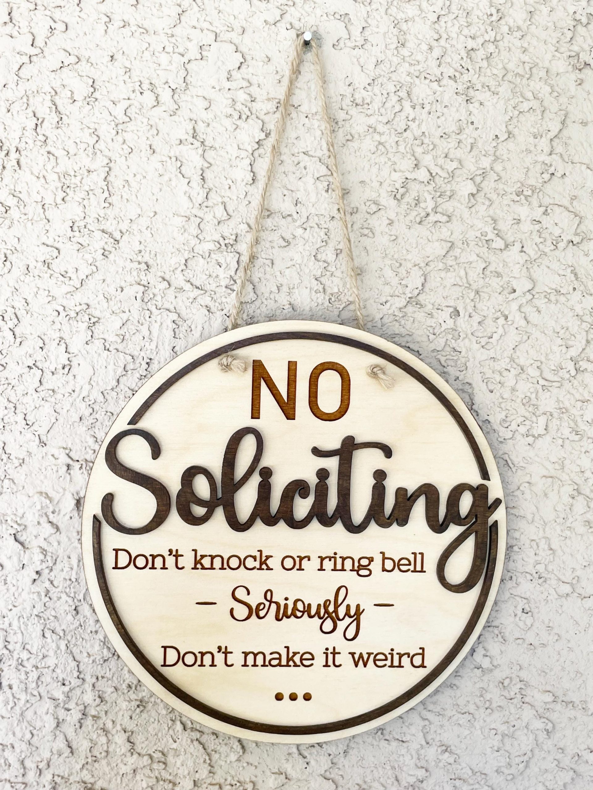 Fend off those solicitors with a little humor! This wood sign says “No Soliciting – Seriously – Don’t Knock or Ring Bell, Don’t Make It Weird”. All words are engraved except “Soliciting” is a 2nd layer of wood. This would make a great housewarming gift!