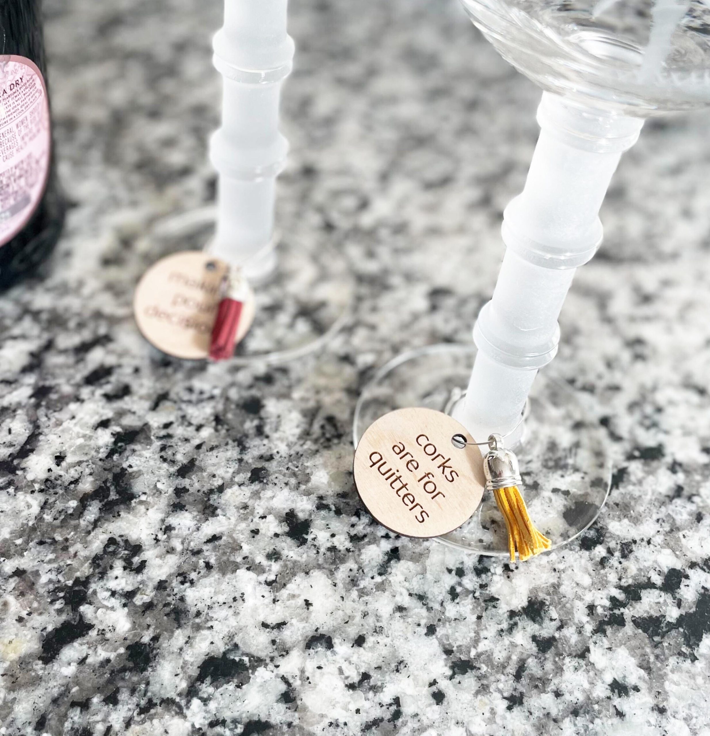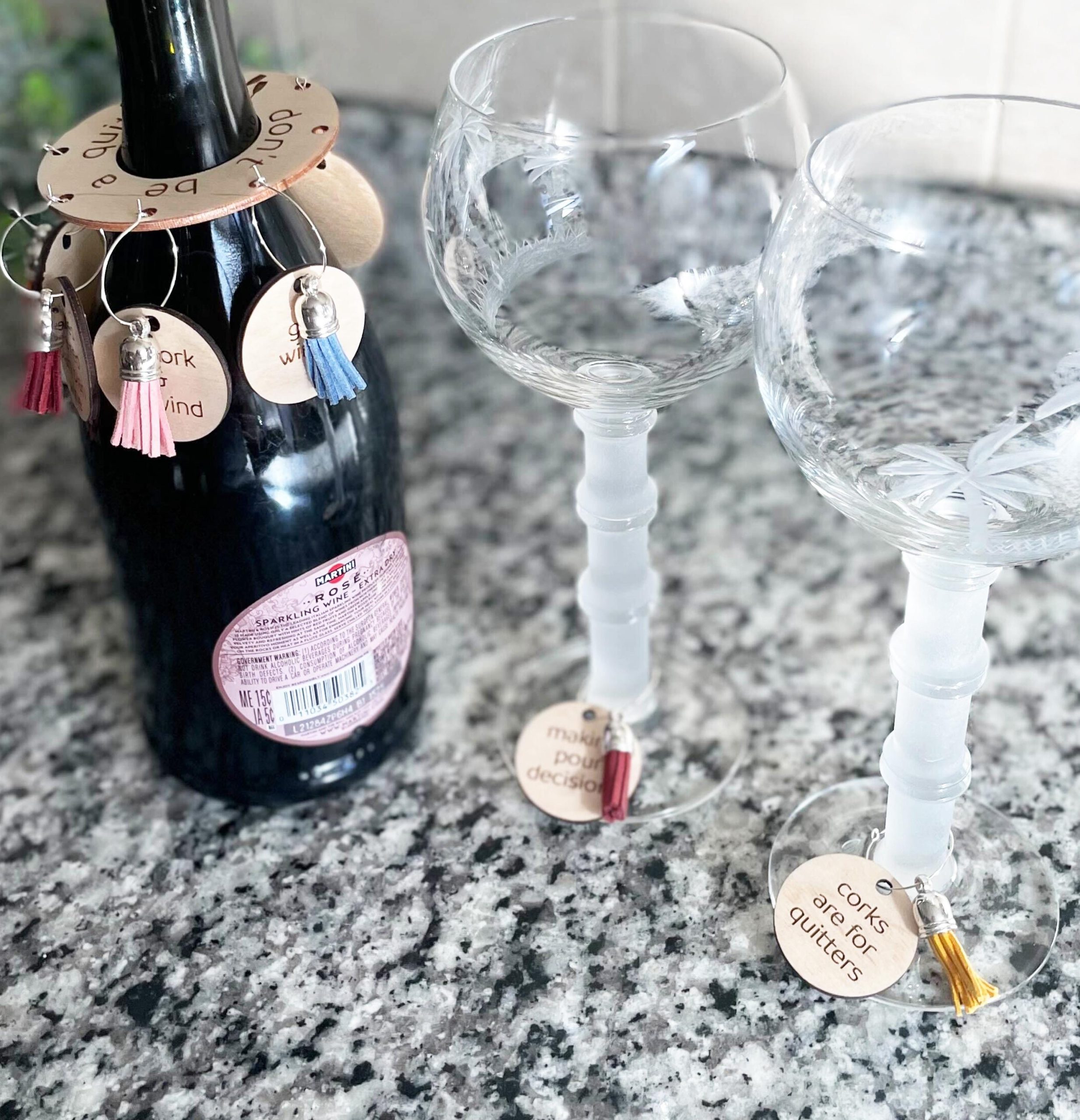 • The charms say: “corks are for quitters”, “making pour decisions”, “save water, drink wine”, “drinks well with others”, “I wine a lot”, “roses are red, blah blah wine”, “uncork and unwind” and “got wine?”