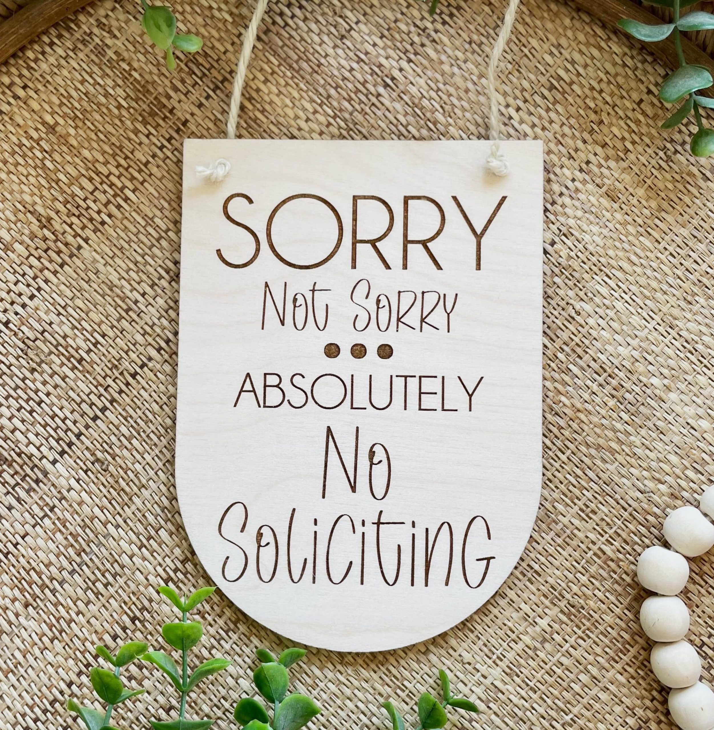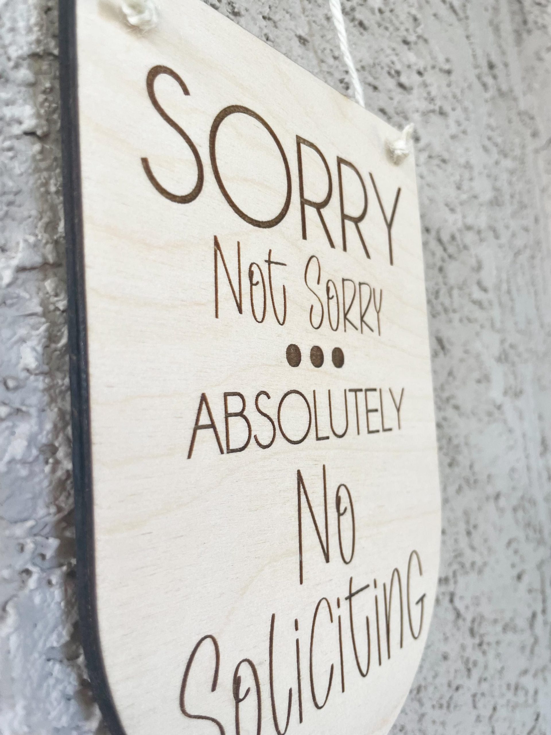 This “SORRY Not Sorry – Absolutely No Soliciting” sign is blunt and to the point, while still being a stylish addition to your front porch decor! Made of 1/4″ baltic birch plywood, all words are engraved.