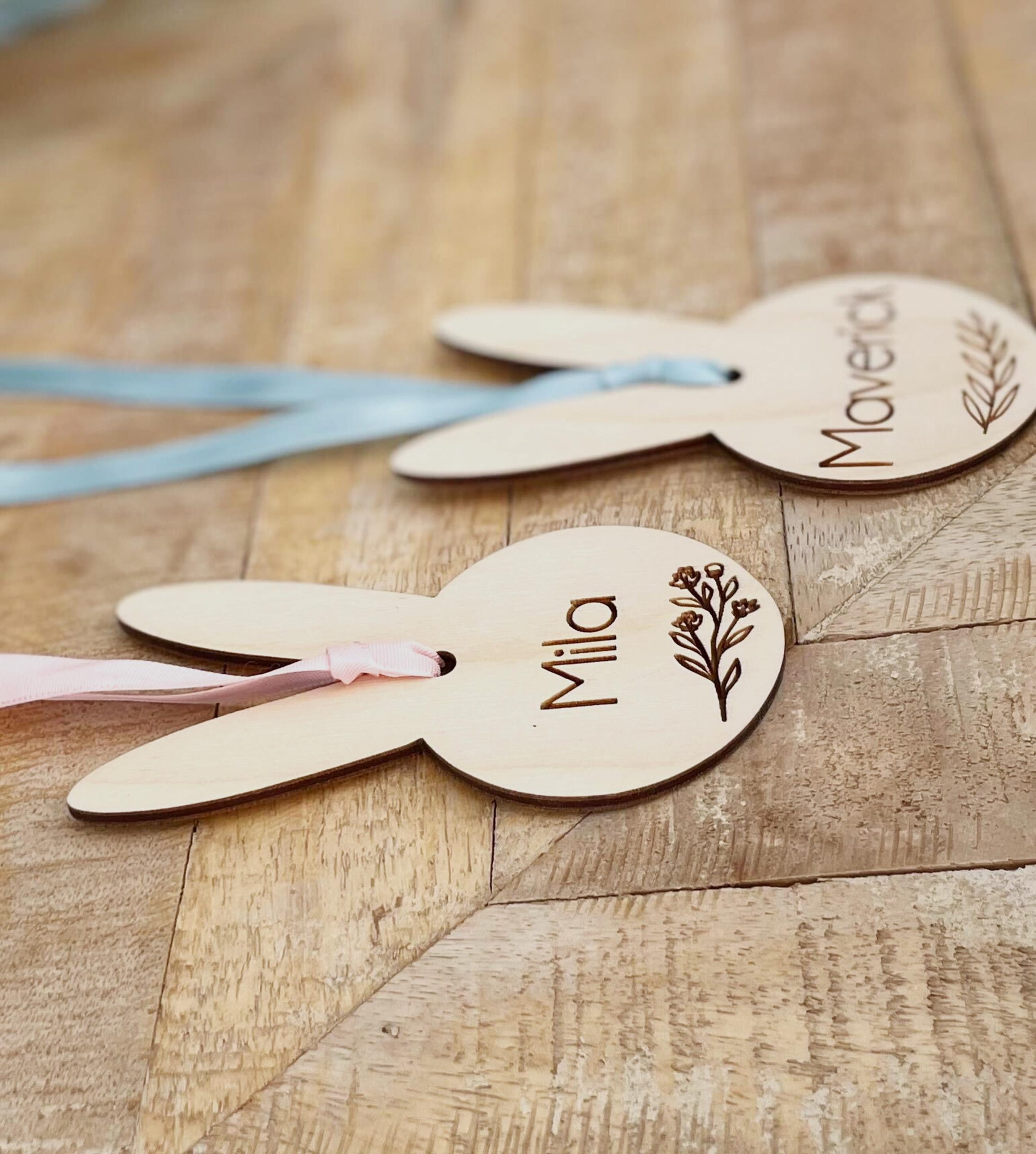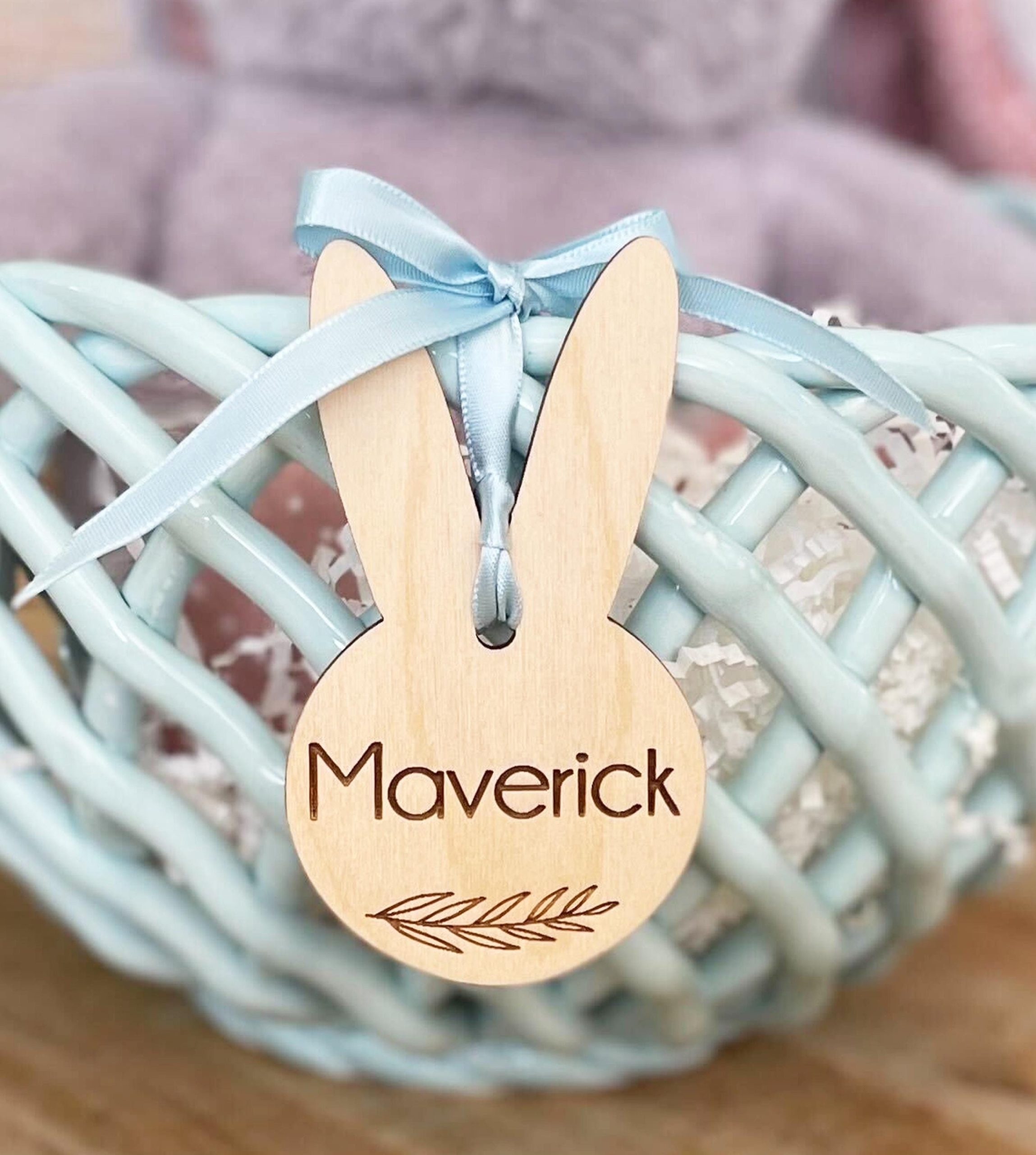 This adorable bunny ears Easter basket tag is engraved with your child’s name and a simple leaf design for a clean, contemporary look that will grow with your child through the years. The bunny measures approx. 4.25″ tall and comes with ribbon to attach to your basket. To coordinate with this one, you can also choose a more girly style with flowers engraved, rather than leaves.
