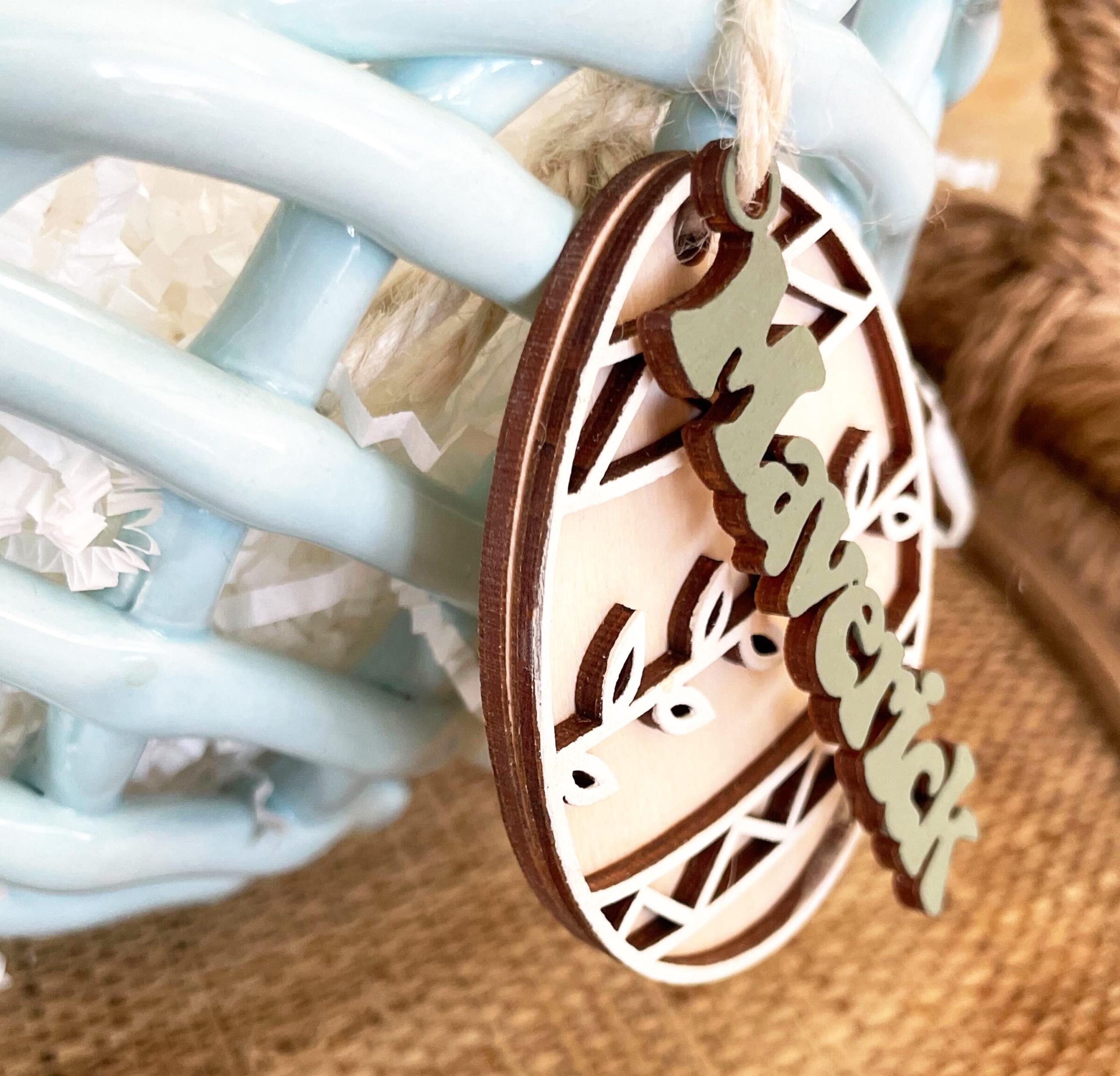 This cute wooden Easter egg has a cute pattern as a second layer, and the name is a separate piece that you hang on it! Choose your color for the name and the frame. It comes in two sizes an comes with natural twine to attach to your basket.