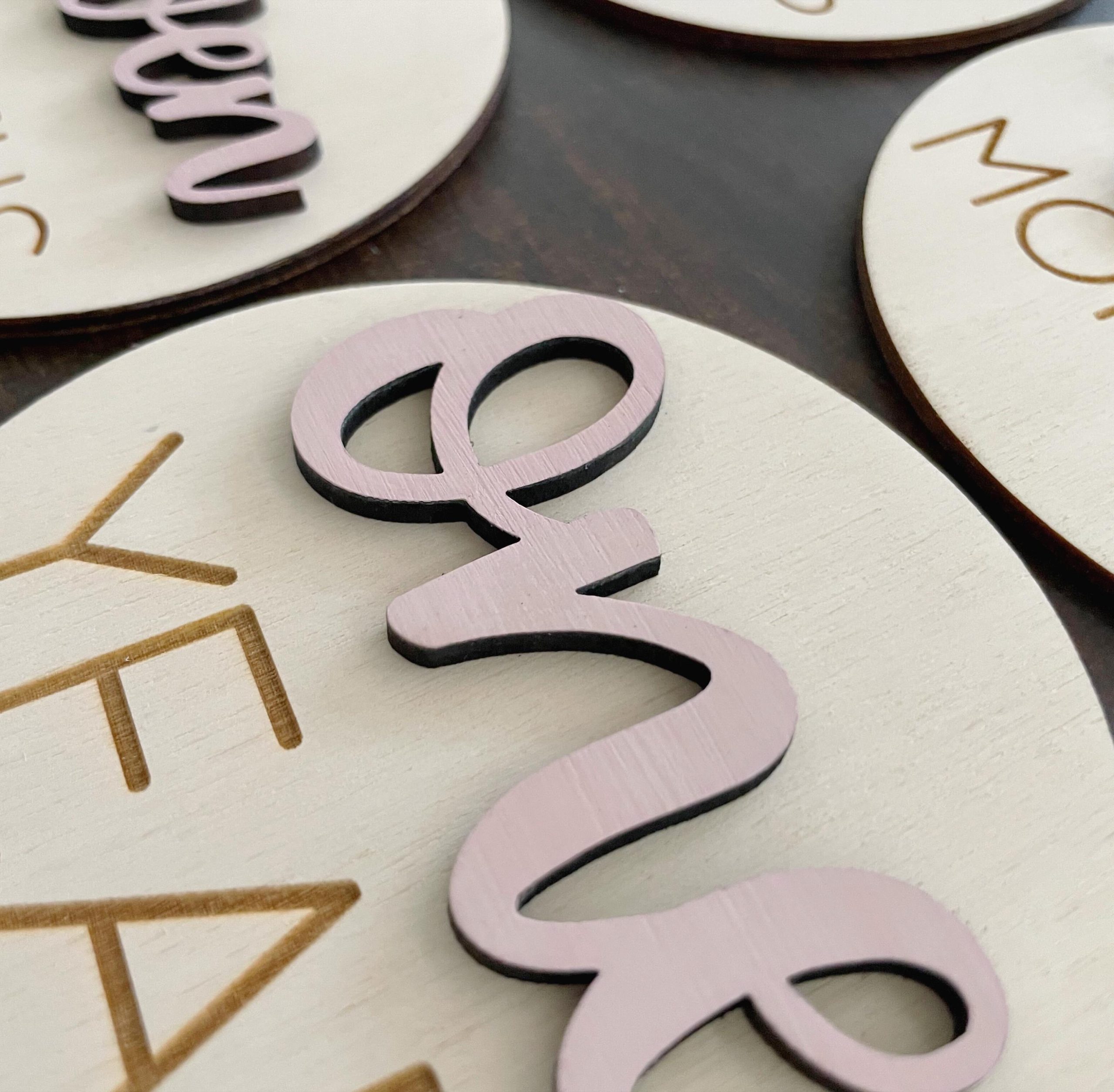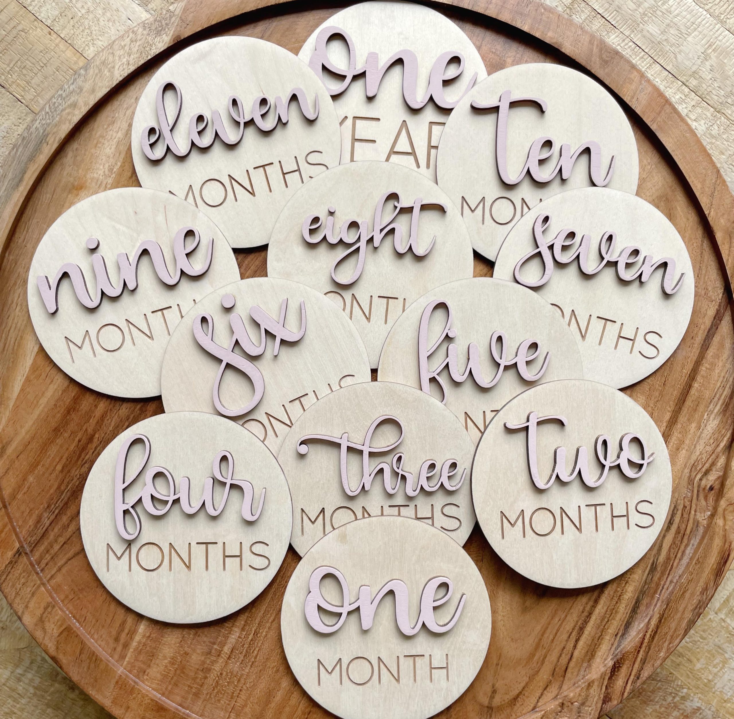 Documents your baby’s growth for the first year through photos using our wooden monthly markers! The months and first name will be a 2nd layer of wood to have a 3D effect. The second name and “MONTHS” will be engraved. You choose the paint color for the raised words. These will help you create a treasured collection of photos showing the progression of your baby’s first year.