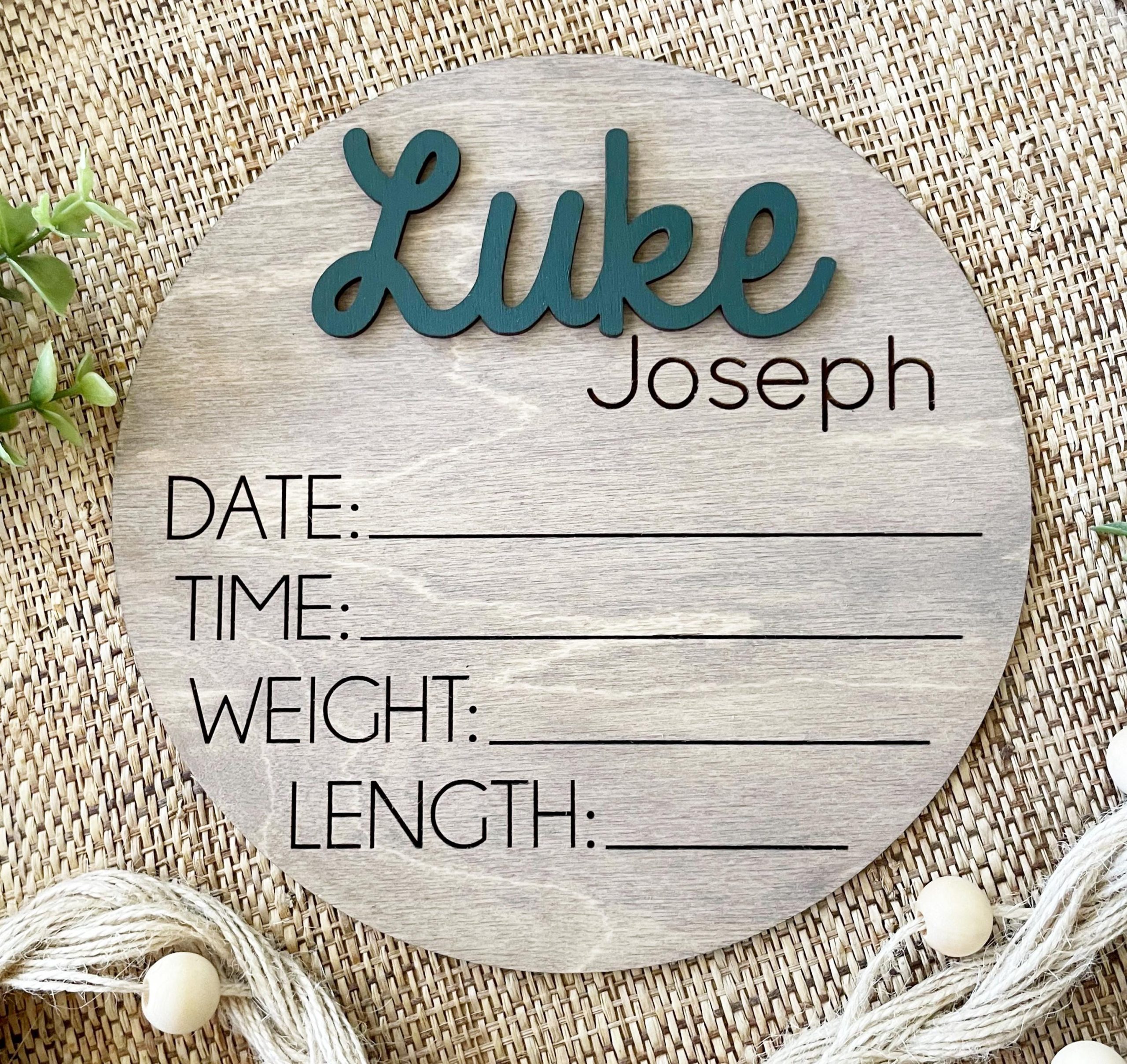Announce your baby’s birth with this adorable wood sign! Baby’s first name will be raised, 3D style, and the rest engraved. Fill in your baby’s stats and snap those first photos with this sign, then display in your nursery at home.