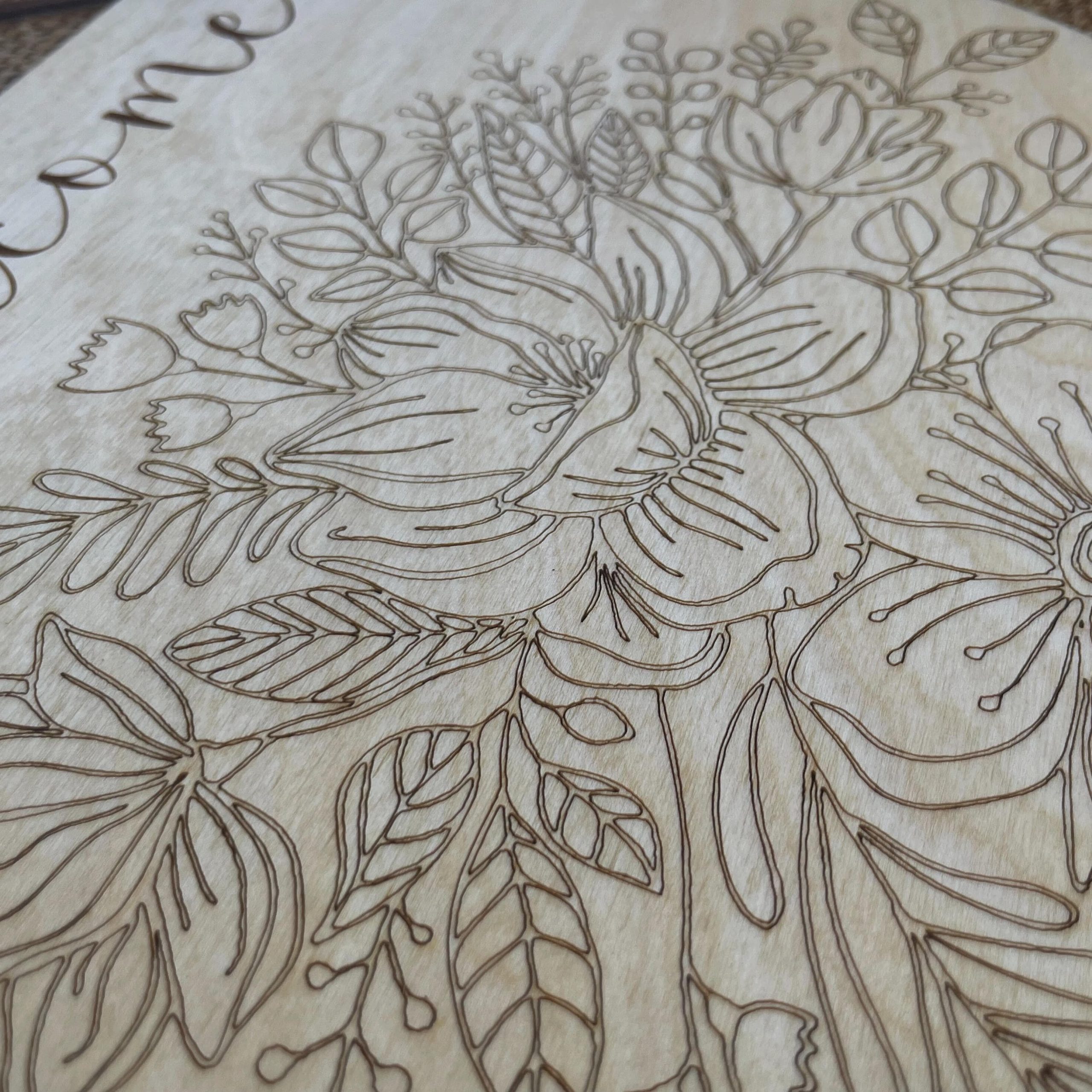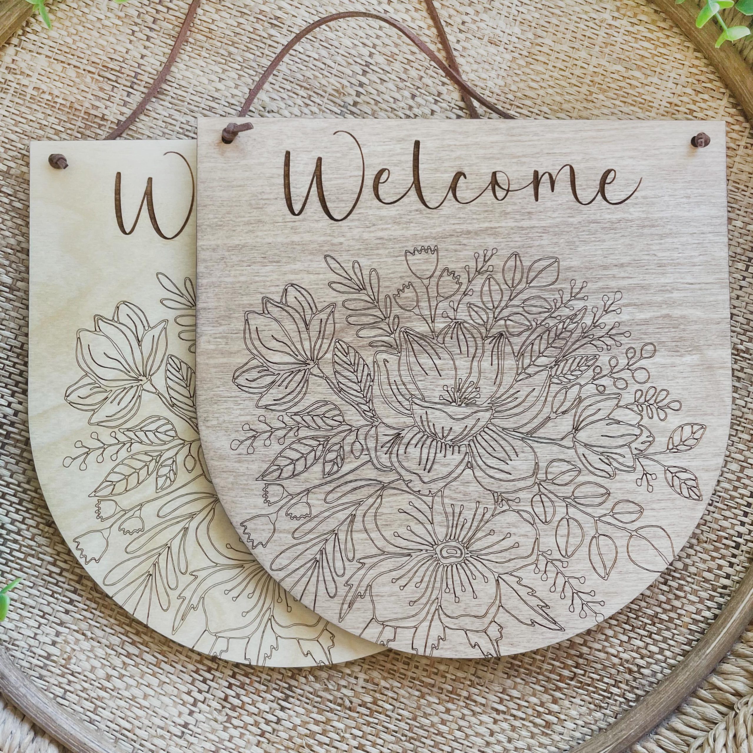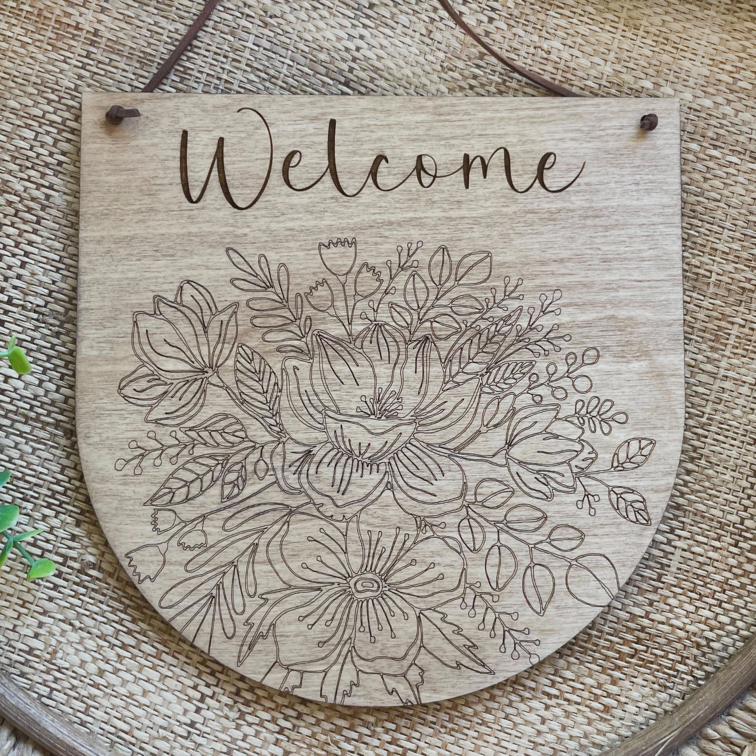 Add charm to your entryway with this adorable welcome sign that features magnolia bouquet line art! It is cut in a cute arch shape and meticulously crafted from high-quality wood, ensuring both durability and a natural aesthetic that enhances your space.