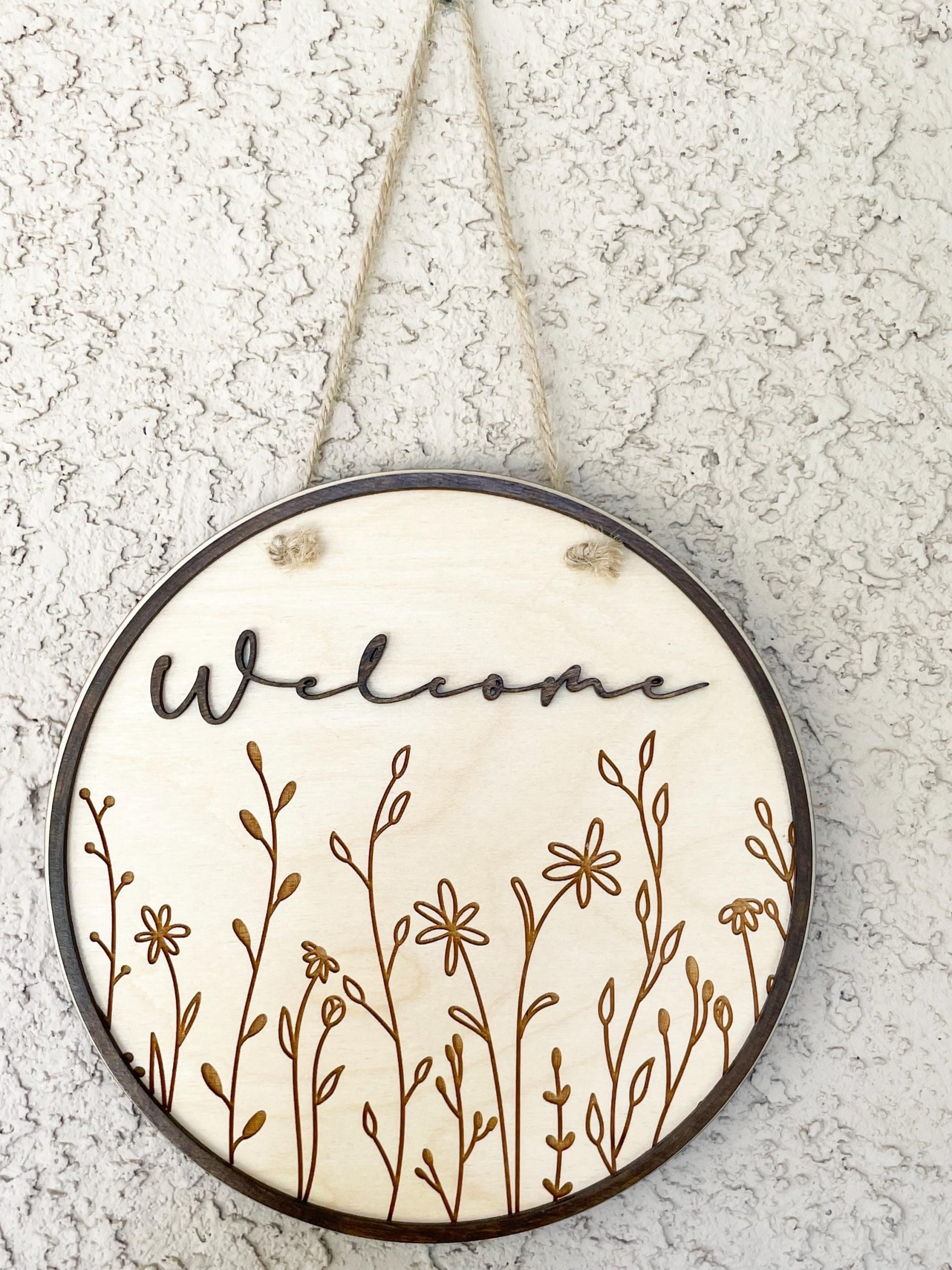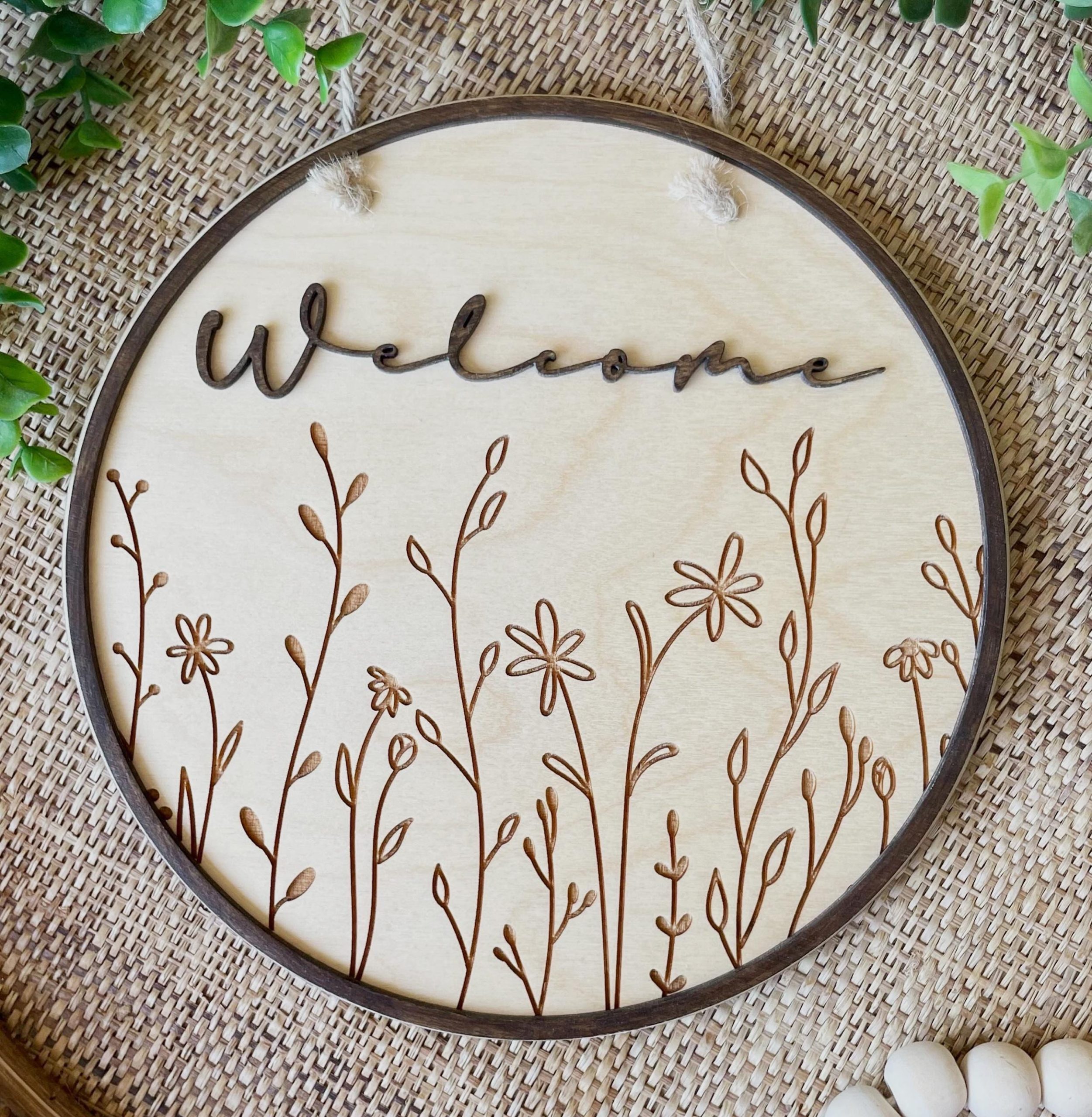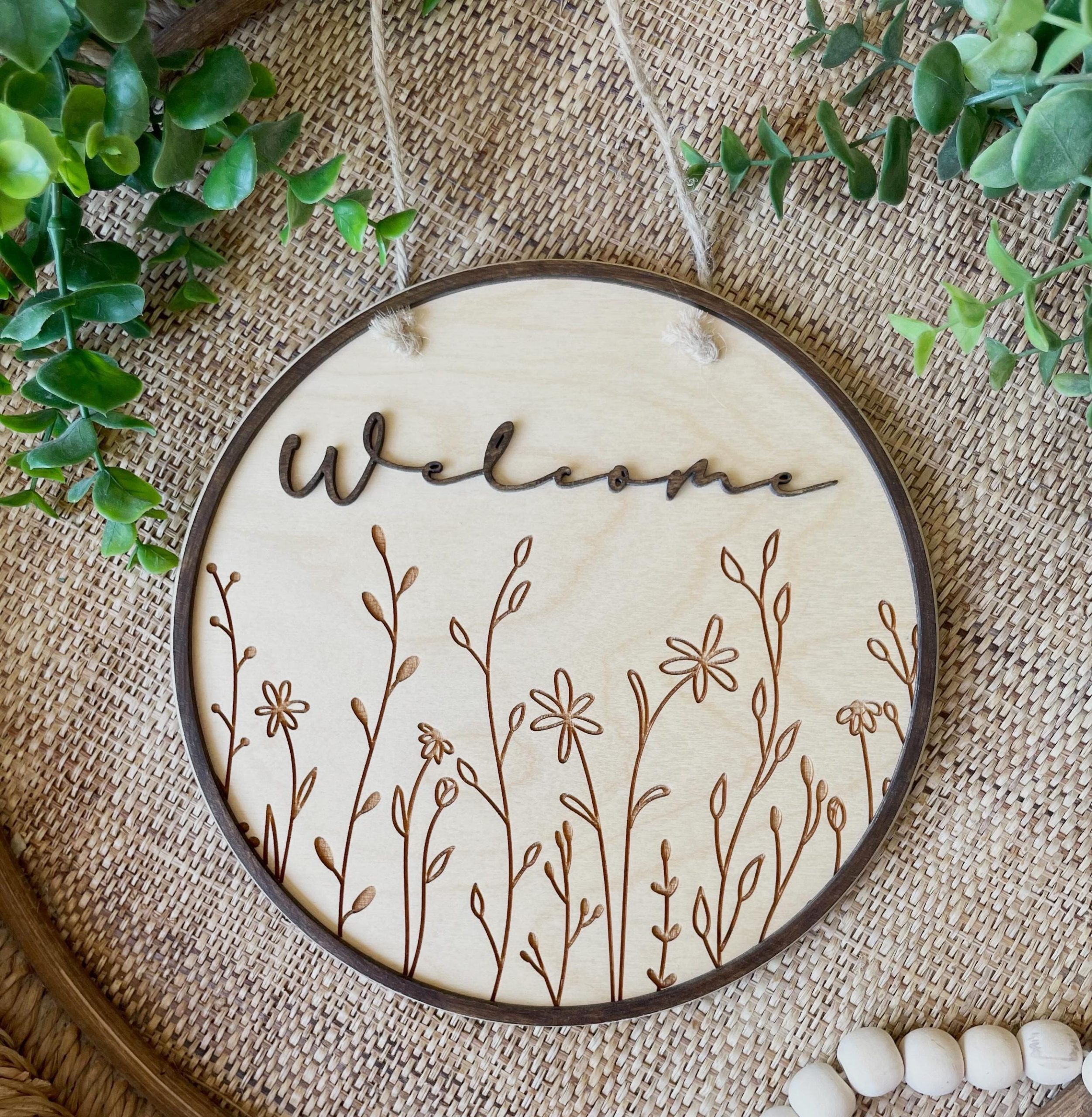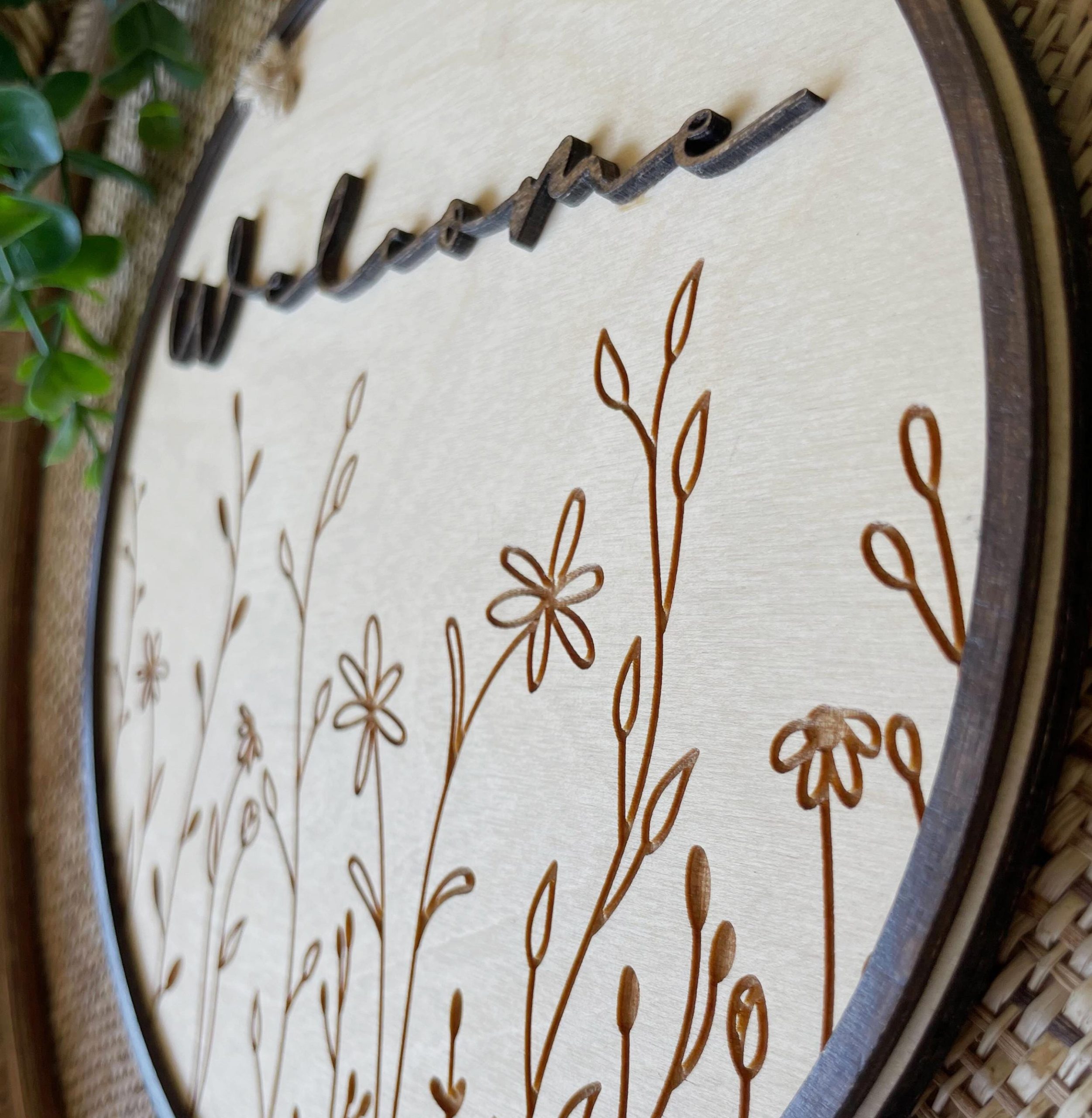 Welcome guests with this cute floral “Welcome” sign. Beautiful wildflowers are engraved on the back layer of wood, and the word Welcome and the circle are a 2nd layer of wood.