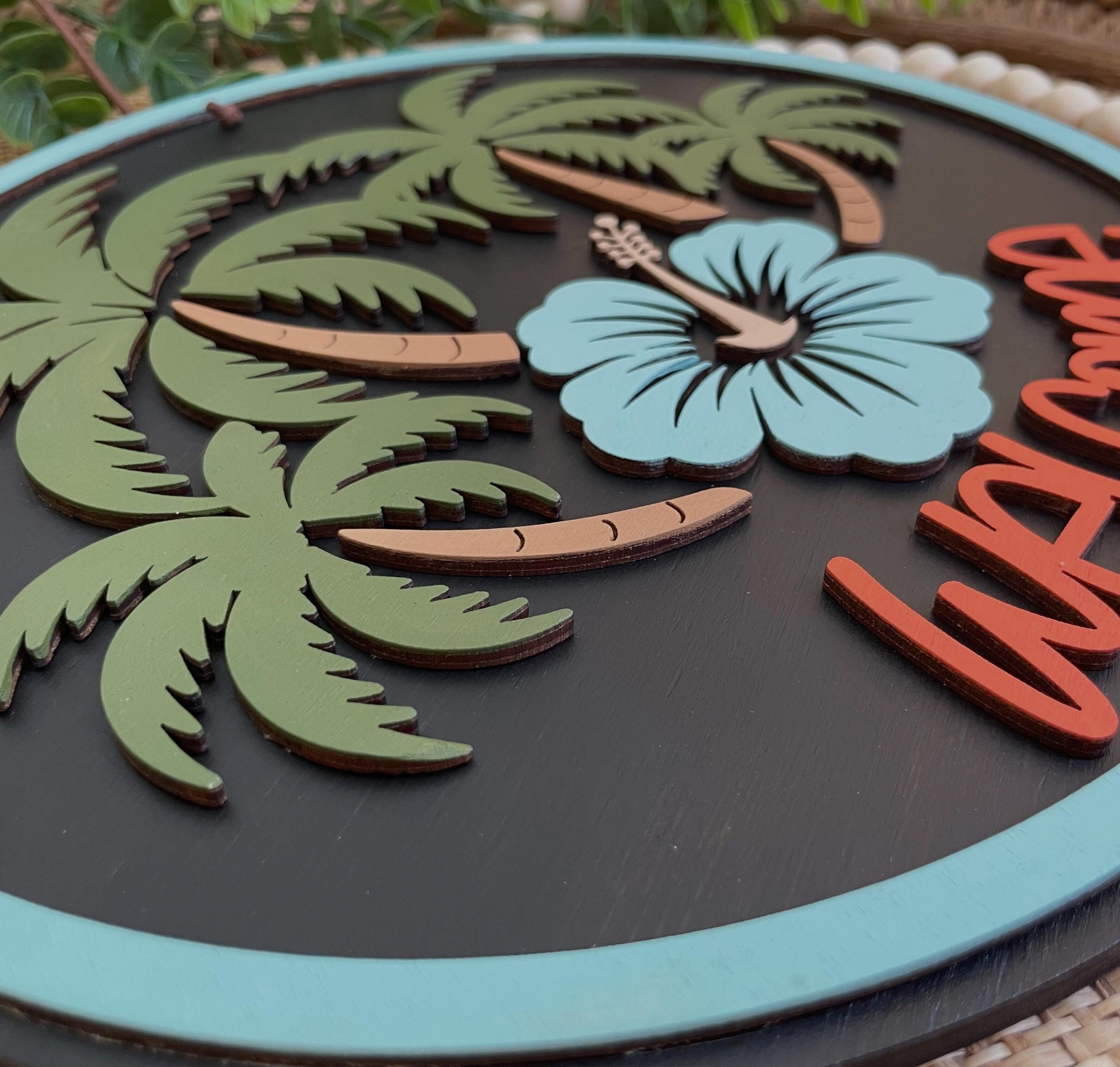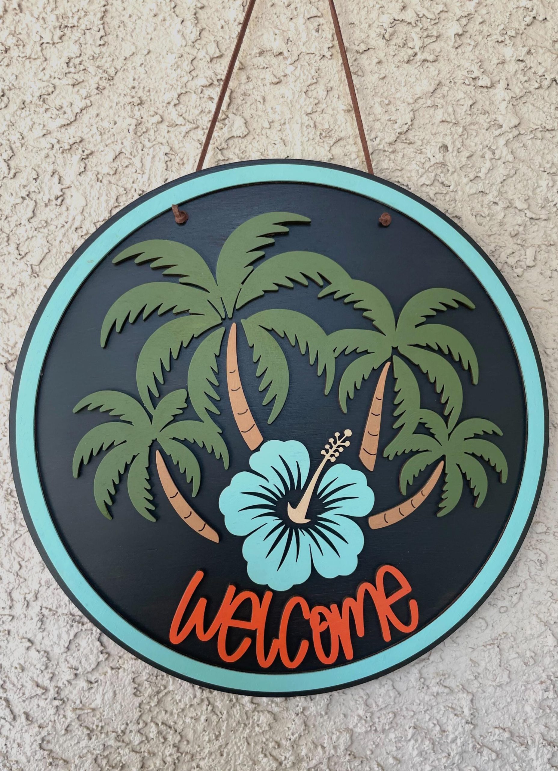 Give off those island vibes while you welcome guests with this tropical style welcome sign featuring palm trees and a blue hibiscus flower. The base layer is stained a gorgeous dark espresso color, giving this sign a sophisticated island feel. Made from baltic birch plywood. Makes a great gift for someone in that new apartment or home!