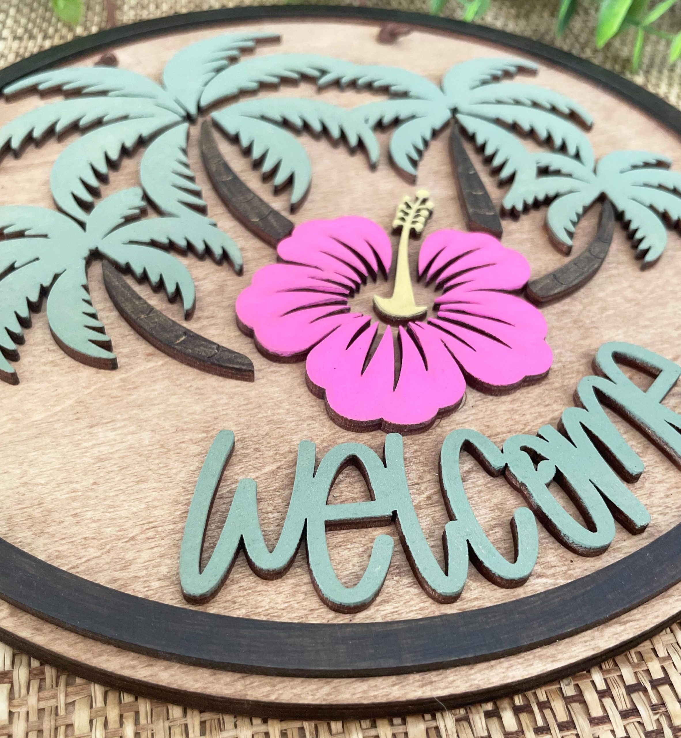 Give off those tropical vibes while you welcome guests with this cute welcome sign featuring palm trees and a bright pink hibiscus flower. Made from baltic birch plywood. Makes a great gift for someone in that new apartment or home!