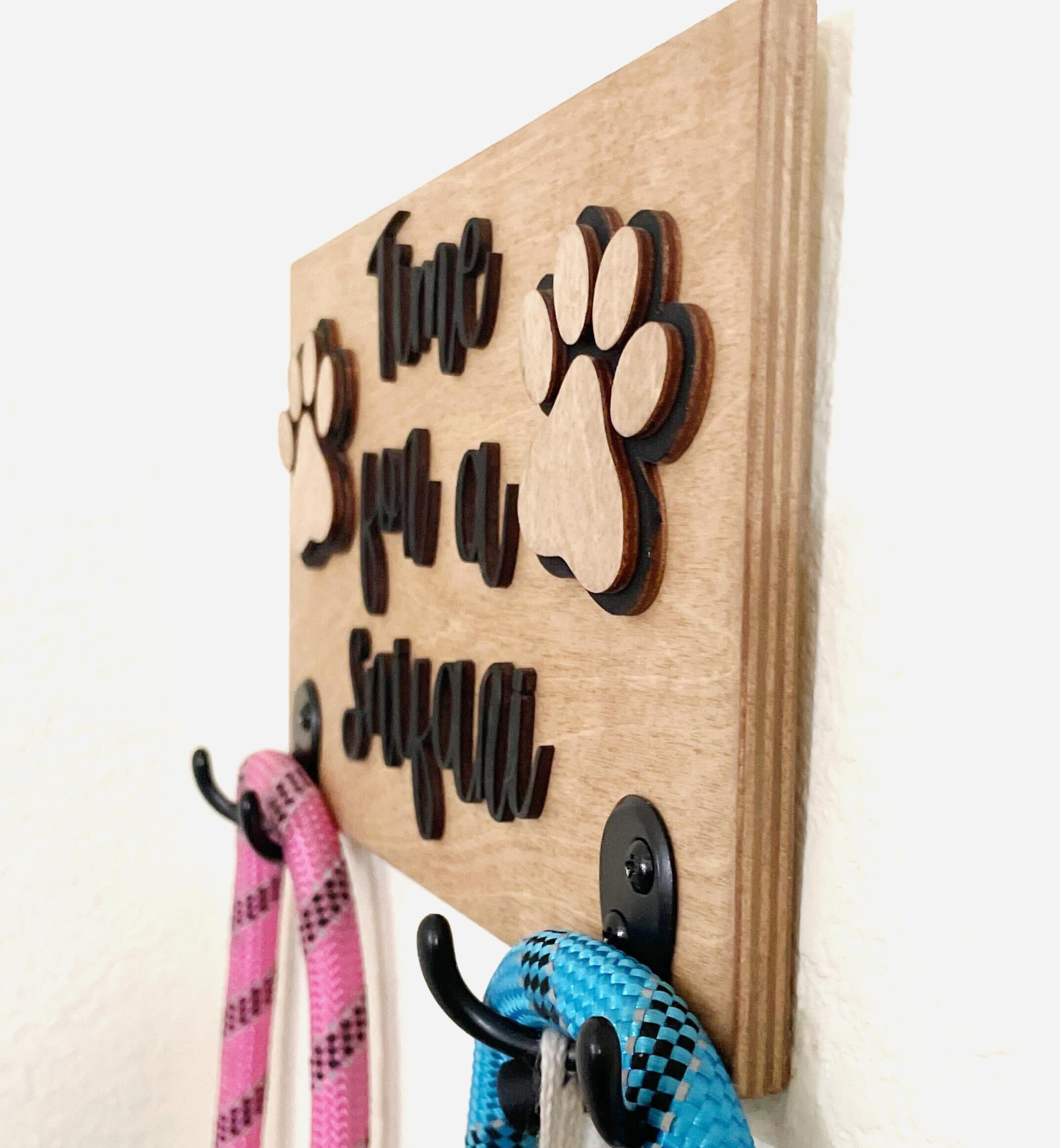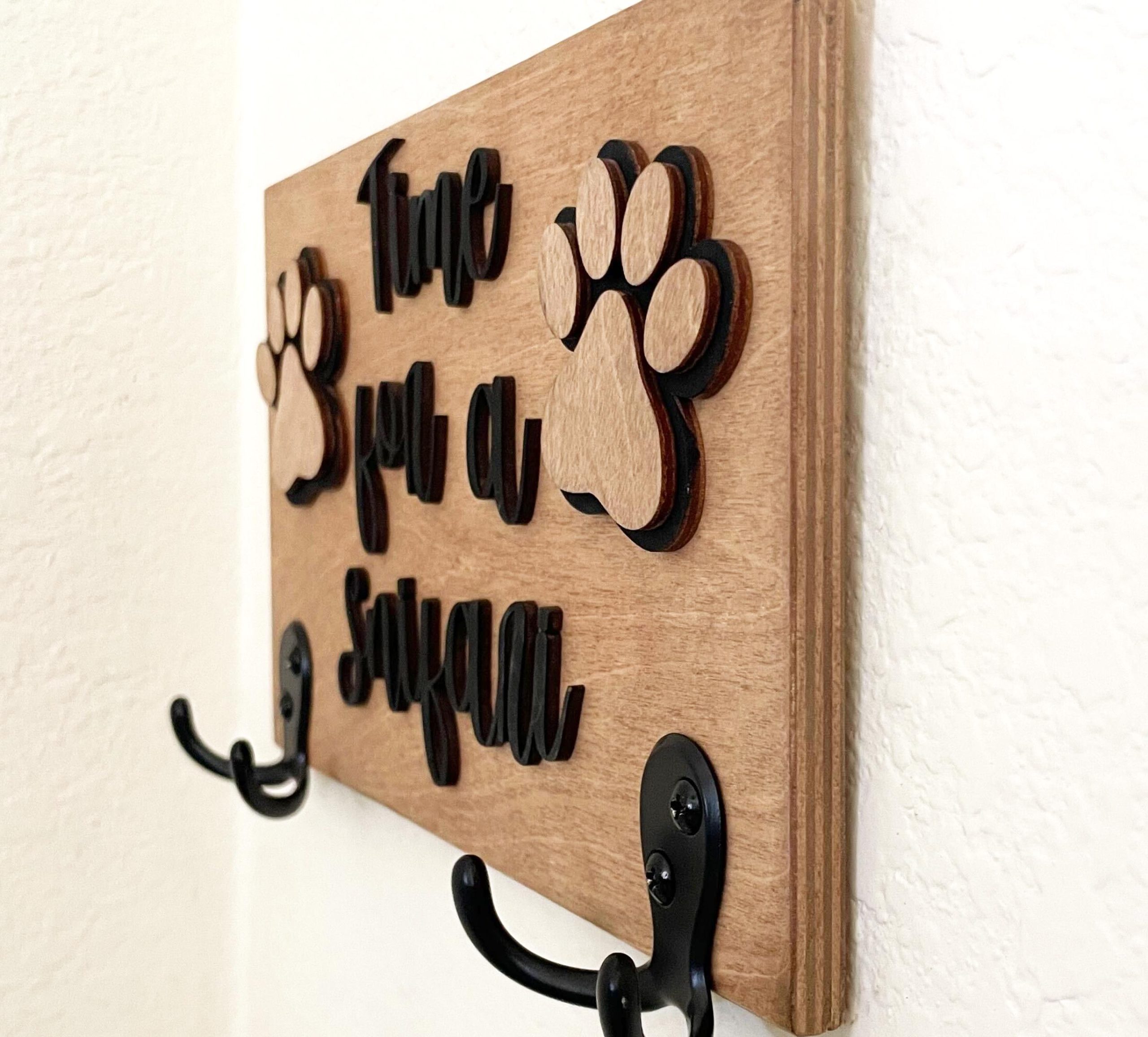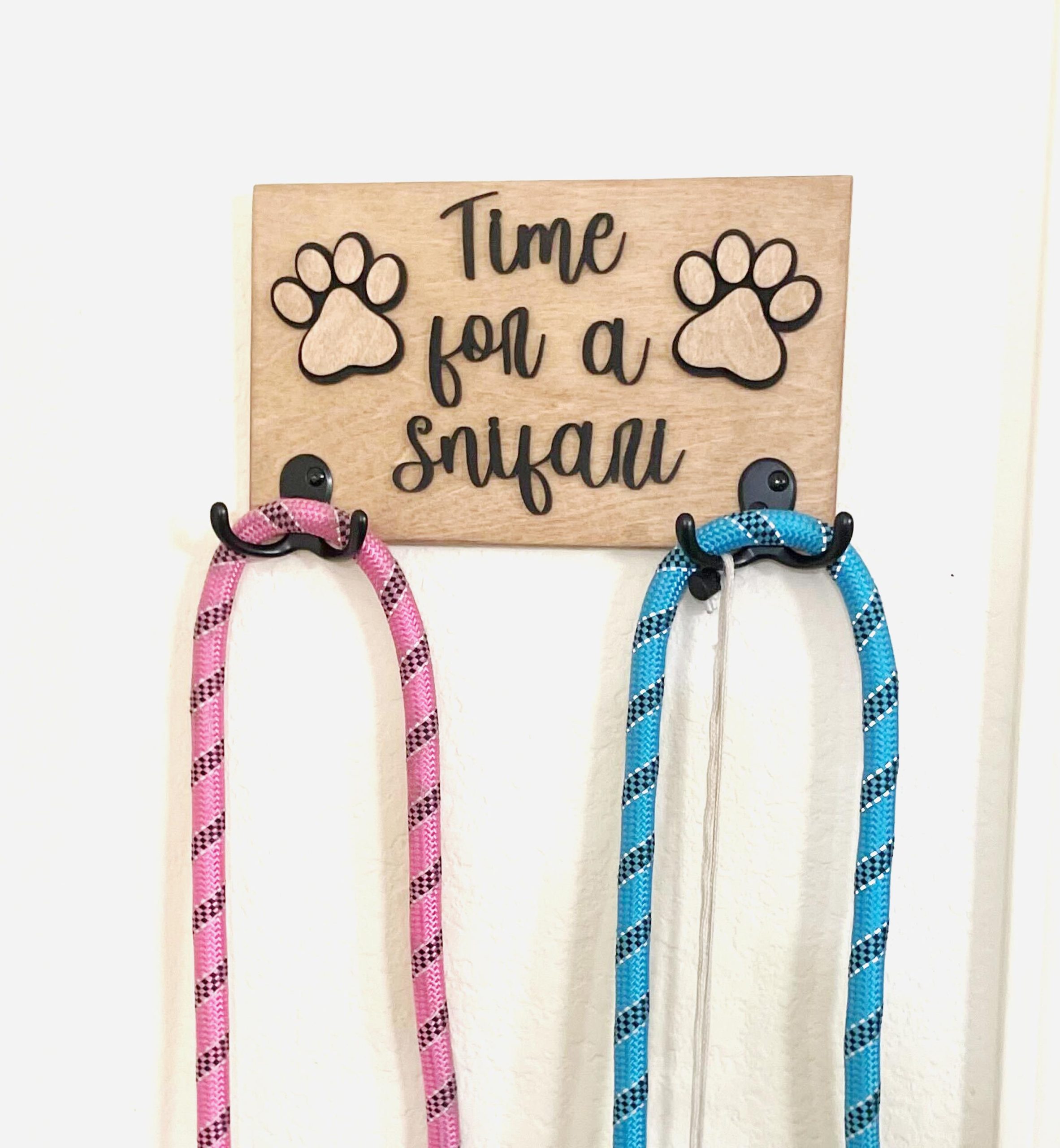 This leash holder features two double hooks that are perfect for hanging leashes – hang up to 4! A second layer of wood says “Time for a Snifari” in a fun font, along with 3D paw prints on each side.